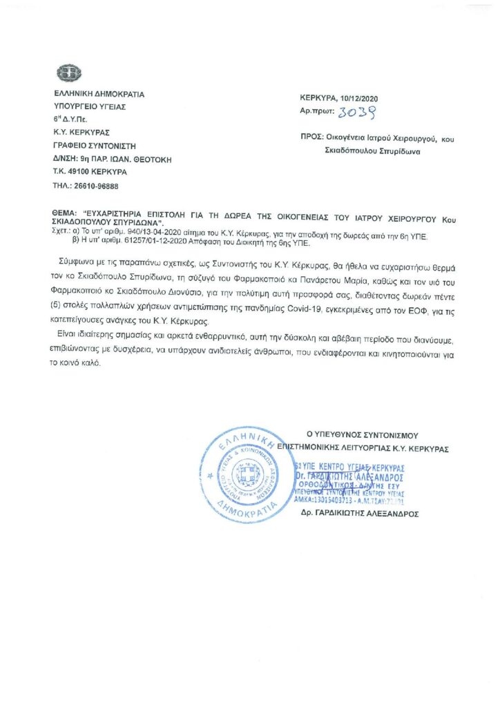 Ευχαριστήρια Επιστολή του Κ.Υ. Κέρκυρας, προς την οικογένεια Σκιαδόπουλου Σπυρίδωνα, λόγω της δωρεάς που έκανε ο ίδιος, η σύζυγός του Φαρμακοποιός κα Πανάρετου Μαρία και ο γιος του Φαρμακοποιός Σκιαδόπουλος Διονύσιος, με στολές πολλαπλών χρήσεων αντιμετώπισης της πανδημίας COVID-19.