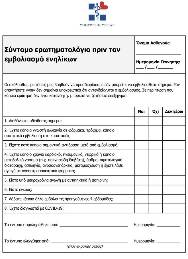 Ουσιαστικά πρόκειται για δύο έντυπα: το ερωτηματολόγιο το οποίο θα συμπληρώνει κάθε πολίτης πριν του χορηγηθεί το εμβόλιο αλλά και ένα έντυπο συναίνεσης “μετά από ενημέρωση για ενήλικες μη δυνάμενους να παράσχουν προφορική συγκατάθεση”.