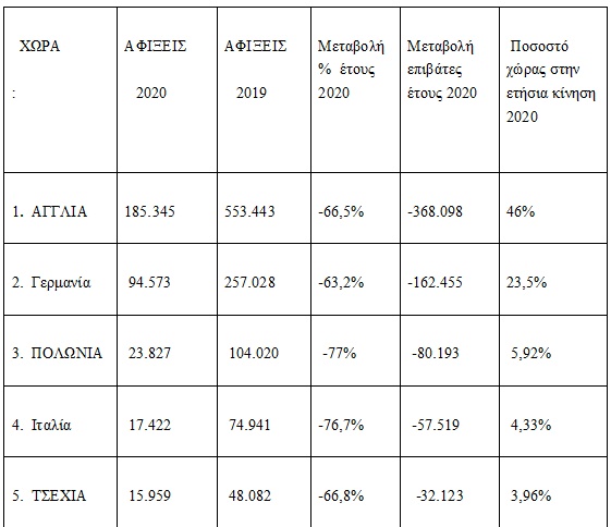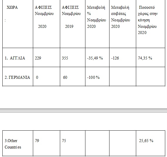 Στους πίνακες που ακολουθούν παρατίθενται τα αναλυτικά στοιχεία των αφίξεων εξωτερικού, για τον μήνα Νοέμβριο, και για το 11μηνο Ιανουαρίου – Νοεμβρίου, που στην ουσία αποτελούν την ετήσια κίνηση του 2020.