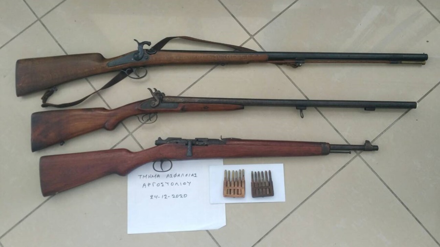 Από την έρευνα στην οικία του ημεδαπού, βρέθηκαν και κατασχέθηκαν δύο (2) κυνηγετικά όπλα και πολεμικό τυφέκιο με δώδεκα σφαίρες, τα οποία κατείχε παράνομα καθώς και μικροποσότητα ακατέργαστης κάνναβης, την οποία είχε στην κατοχή του από κοινού με τον δεύτερο ημεδαπό.