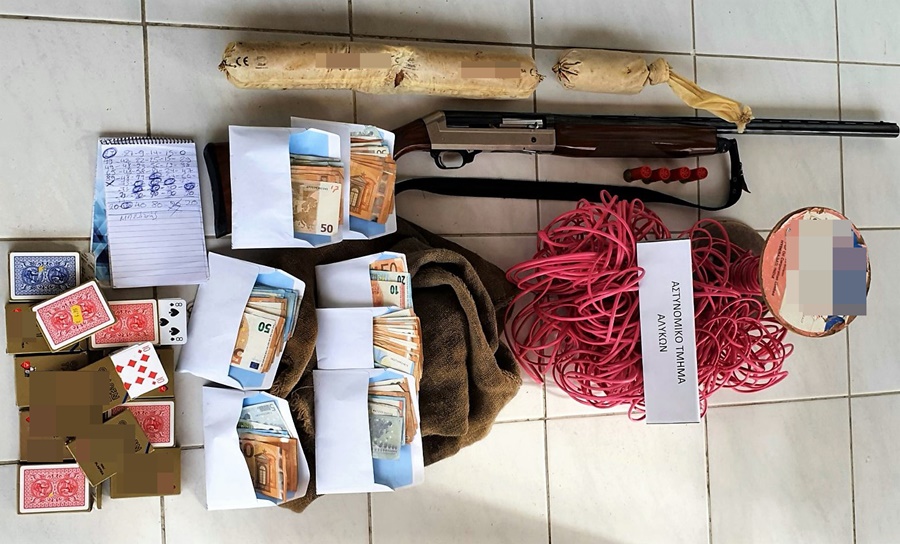 Κατά τον έλεγχο στο χώρο της οικίας βρέθηκαν συνολικά και κατασχέθηκαν το χρηματικό ποσό των (3.225) ευρώ, (12) τράπουλες, (3) μασούρια αμμωνιοδυναμίτιδας και (105) μέτρα φυτίλι, ενώ σε όχημα ενός εκ των συλληφθέντων βρέθηκε και κατασχέθηκε κυνηγετική καραμπίνα με (4) φυσίγγια.