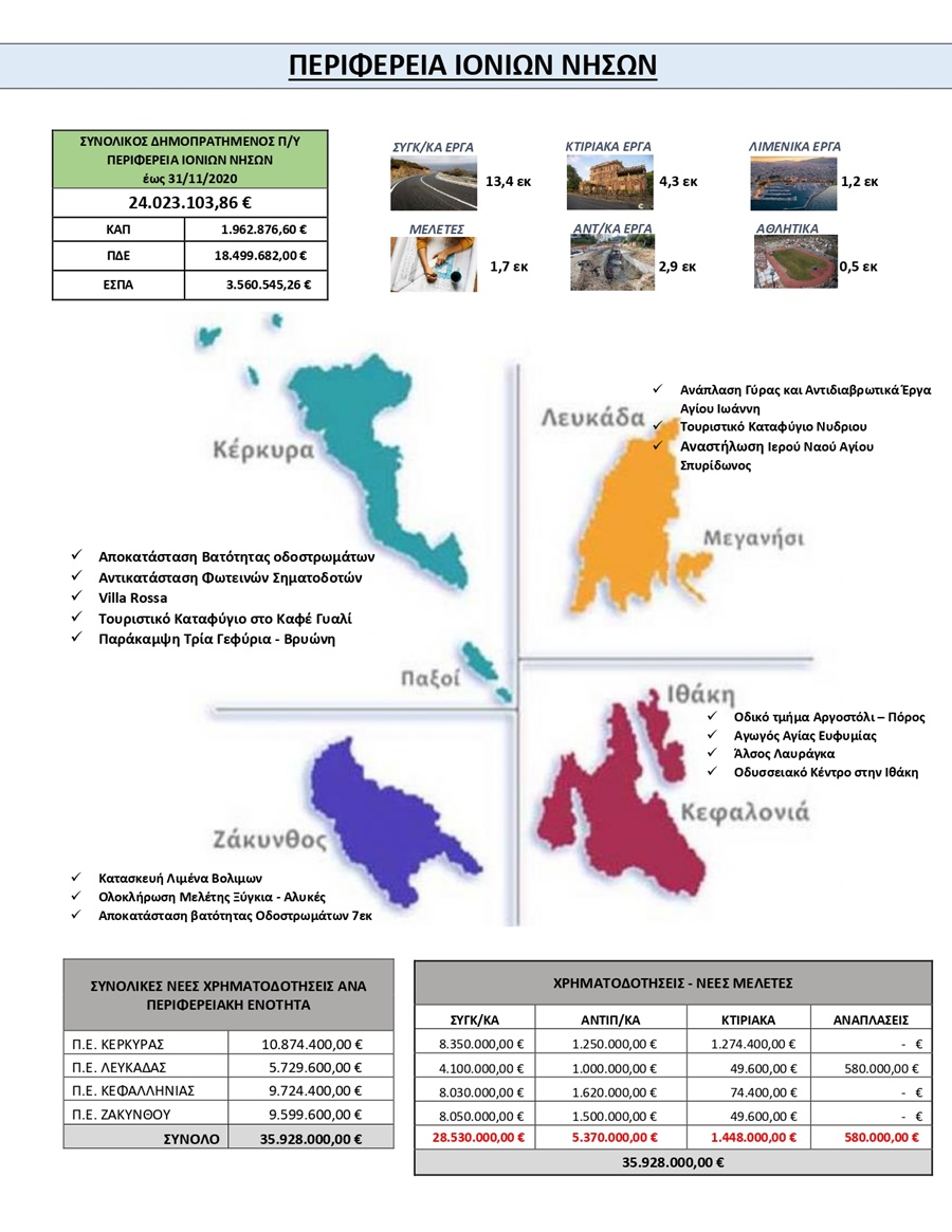 Παράλληλα με την ωρίμανση των μελετών η Περιφερειακή Αρχή έχει έγκριση για νέες χρηματοδοτήσεις, ύψους 30 εκ ευρώ από το Πρόγραμμα Δημοσίων Επενδύσεων για την κατασκευή νέων έργων υποδομής της Περιφέρειας Ιονίων Νήσων καθώς και 5,2 εκ ευρώ για προπαρασκευαστικές μελέτες του Νέου Επιχειρησιακού Προγράμματος ΕΣΠΑ 2021-2027 τα οποία κατανεμήθηκαν στις Περιφερειακές Ενότητες.
