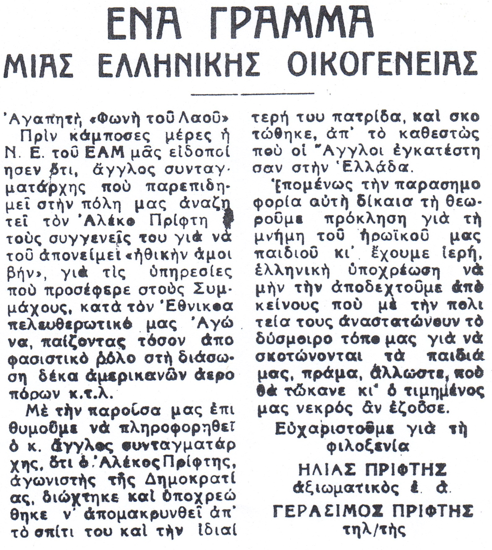 Με την παρούσα μας επιθυμούμε να πληροφορηθεί ο κ. άγγλος συνταγματάρχης, ότι ο Αλέκος Πρίφτης, αγωνιστής της Δημοκρατίας, διώχτηκε και υποχρεώθηκε ν’ απομακρυνθεί απ’ το σπίτι του και την ιδιαίτερή του πατρίδα και σκοτώθηκε απ’ το καθεστώς που οι Άγγλοι εγκατέστησαν στην Ελλάδα.