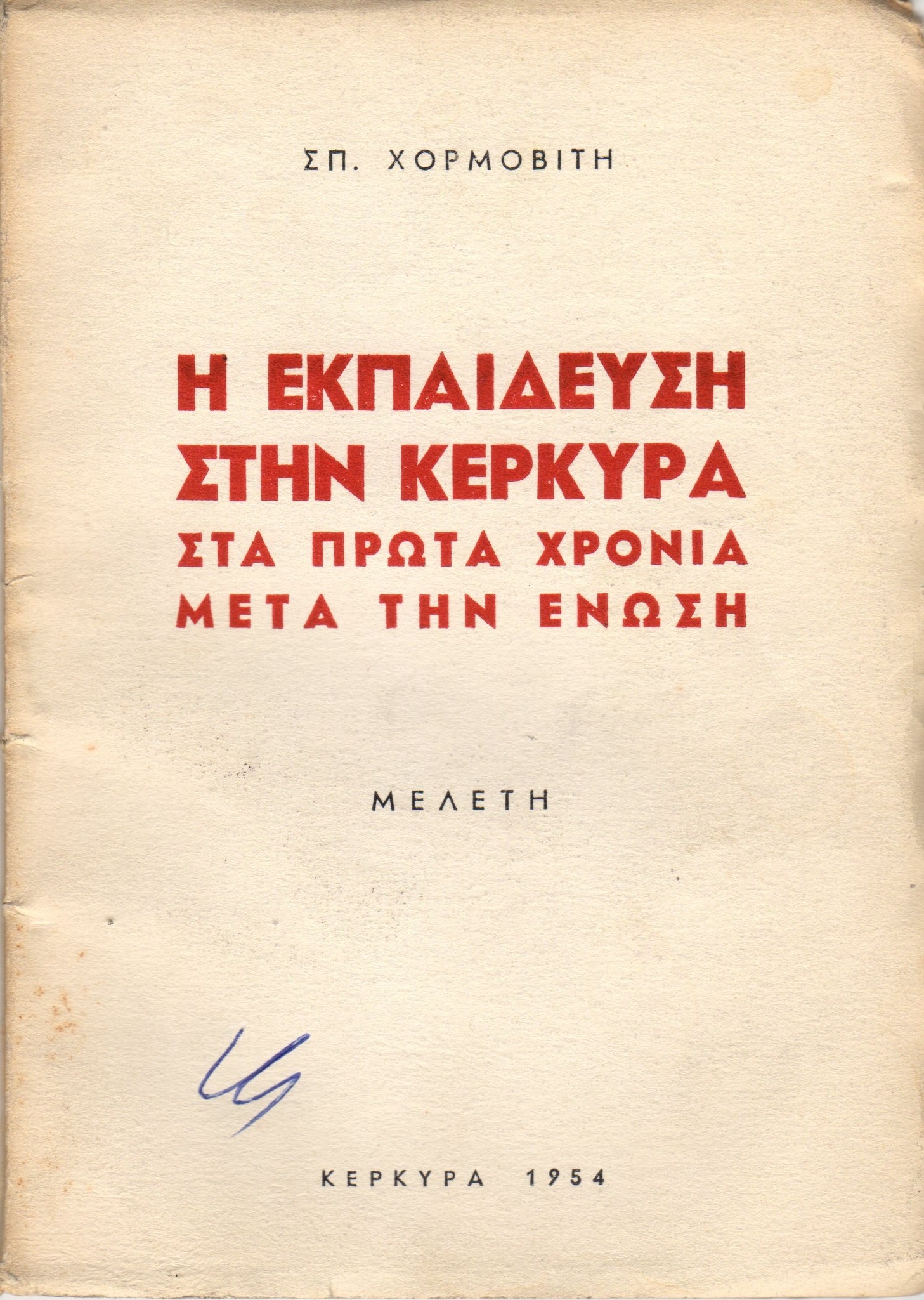 Το 1954 ολοκλήρωσε κι εξέδωσε στην Κέρκυρα τη μελέτη «Η Εκπαίδευση στην Κέρκυρα στα πρώτα χρόνια μετά την Ένωση», με το ψευδώνυμο Σπύρος Χορμοβίτης. Επισήμαινε ότι «χρειάστηκε να καταλυθεί η Βενετσιάνικη κυριαρχία και να λυγίσει η εξουσία των ευγενών για να ριχτεί ο σπόρος της Εκπαίδευσης στην Κέρκυρα», αλλά συνεχιζόταν ακόμη και «είκοσι χρόνια μετά τον παλλαϊκό ριζοσπαστικόν αγώνα που πραγματοποίησε την Ένωση, η μεσαιωνική κατάσταση». Αυτό, σημείωνε, «οφείλεται -χρειάζεται με ειλικρίνεια και τόλμη να ειπωθεί πολλές φορές ακόμα- στο ότι και μετά την Ένωση πολιτικά κυρίαρχοι έμειναν οι παλιοί εντόπιοι δυνάστες, συνεχίζοντας την κοινωνική καταπίεση και την οικονομική εκμετάλλευση».
