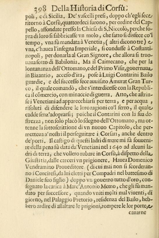 «Η τιμωρία τούτων των ληστών της θάλασσας μού φέρνει στο νου την τιμωρία που επέβαλαν οι Βενετσιάνοι το 1640 σε κάποιους ληστές της στεριάς, οι οποίοι θέλησαν να αποσπάσουν, σε πείσμα της Δικαιοσύνης, από τις φυλακές κάποιον κρατούμενο. Ο Προνοητής Ντομένικο Βεντραμίνο (που ποτέ δεν θα τον ξεχάσουν οι Κερκυραίοι, τους οποίους εκείνος είχε επιλέξει για ανάδοχους στη βάφτιση του γιου του, του Ντανιέλε), μετά από μια ολόχρυση διακυβέρνηση, είχε παραδώσει το αξίωμά του στον Μάρκο Αντόνιο Μέμο, ο οποίος είχε σταλεί σαν διάδοχός του, όταν, αφού έσμιξαν πολλοί κακούργοι (mal viventi), μέρα-μεσημέρι, στο Διοικητήριο (Palaggio Pretorio), έδρα του Βαΐλου, βρήκαν το θράσος να επιτεθούν στις φυλακές, να σπάσουν τις πύλες τους και να βγάλουν από κει κάποιον, που για τα τεράστια εγκλήματά του άξιζε χίλιους θανάτους. Οι περιστάσεις του γεγονότος, του τόπου, του χρόνου, του προσώπου και της συνωμοσίας έκαναν τόσο βαρύτερο τούτο το κρίμα ώστε η Ρεπούμπλικα, αφού ενημερώθηκε γι’ αυτή την αθλιότητα, έστειλε τον Λουίτζι Τζόρτζι με τον τίτλο του Γενικού Διοικητή, παρότι προοριζόταν για Γενικός Προνοητής των τριών νησιών. Ήταν άνθρωπος ακατάβλητης αυστηρότητας και το απέδειξε σωστά εναντίον των κακών (rei), από τους οποίους άλλους καταδίκασε στην εσχάτη των ποινών κι άλλους, τους λιγότερο ένοχους, σε φυλάκιση, με την επιδοκιμασία των Αγαθών (buoni), που είδαν ν’ απαλλάσσονται από τον φόβο που προκαλούσε στον καθένα η σύμπραξη (unione) εκείνων των πανάθλιων ανθρώπων. Κατόρθωσε τελικά να τους ξεριζώσει ο Πιέτρο Ναβαλιέρ, ο οποίος, έχοντας γίνει Προνοητής το ’42, τη φύση του, φύση αμνού, τη θωράκισε με θάρρος λιονταριού ενάντια στους άθλιους και, καλοσυνάτος με τους Αγαθούς, είχε σφοδρή μανία ενάντια σε όποιον παρανομούσε (contro chi vivea male)».