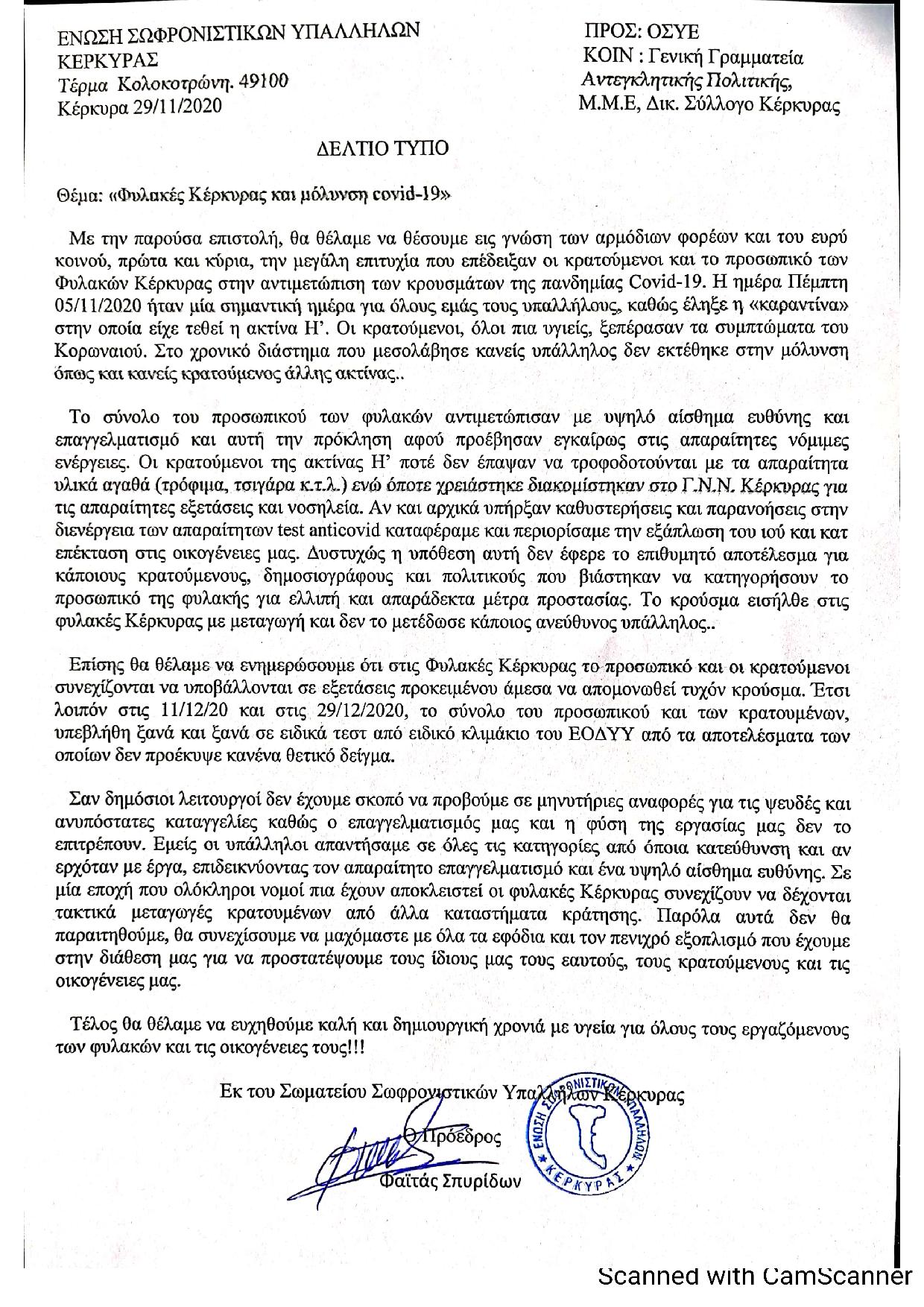 Ανακοίνωση της Ένωσης Σωφρονιστικών Υπαλλήλων Κέρκυρας με την οποία γνωστοποιεί ότι το σύνολο του προσωπικού και των κρατουμένων έκαναν τεστ στις 29/12 και δεν υπήρξε κάποιο θετικό κρούσμα.