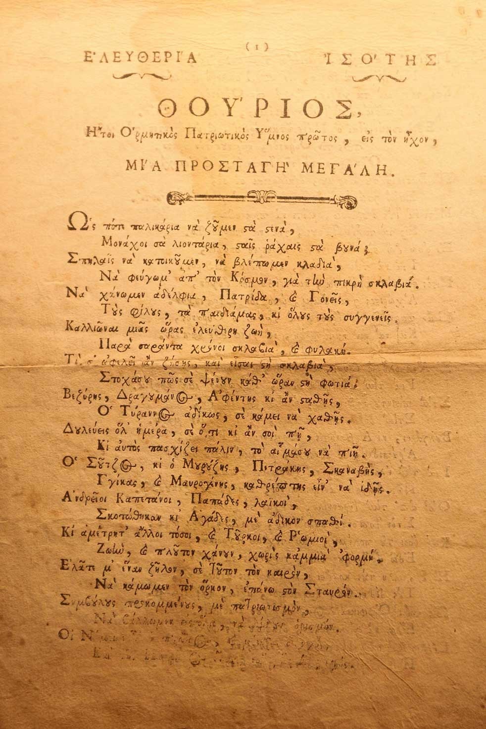 Το 1798, επί Γάλλων Δημοκρατικών, ετυπώθηκε στην Κέρκυρα ο «Θούριος».