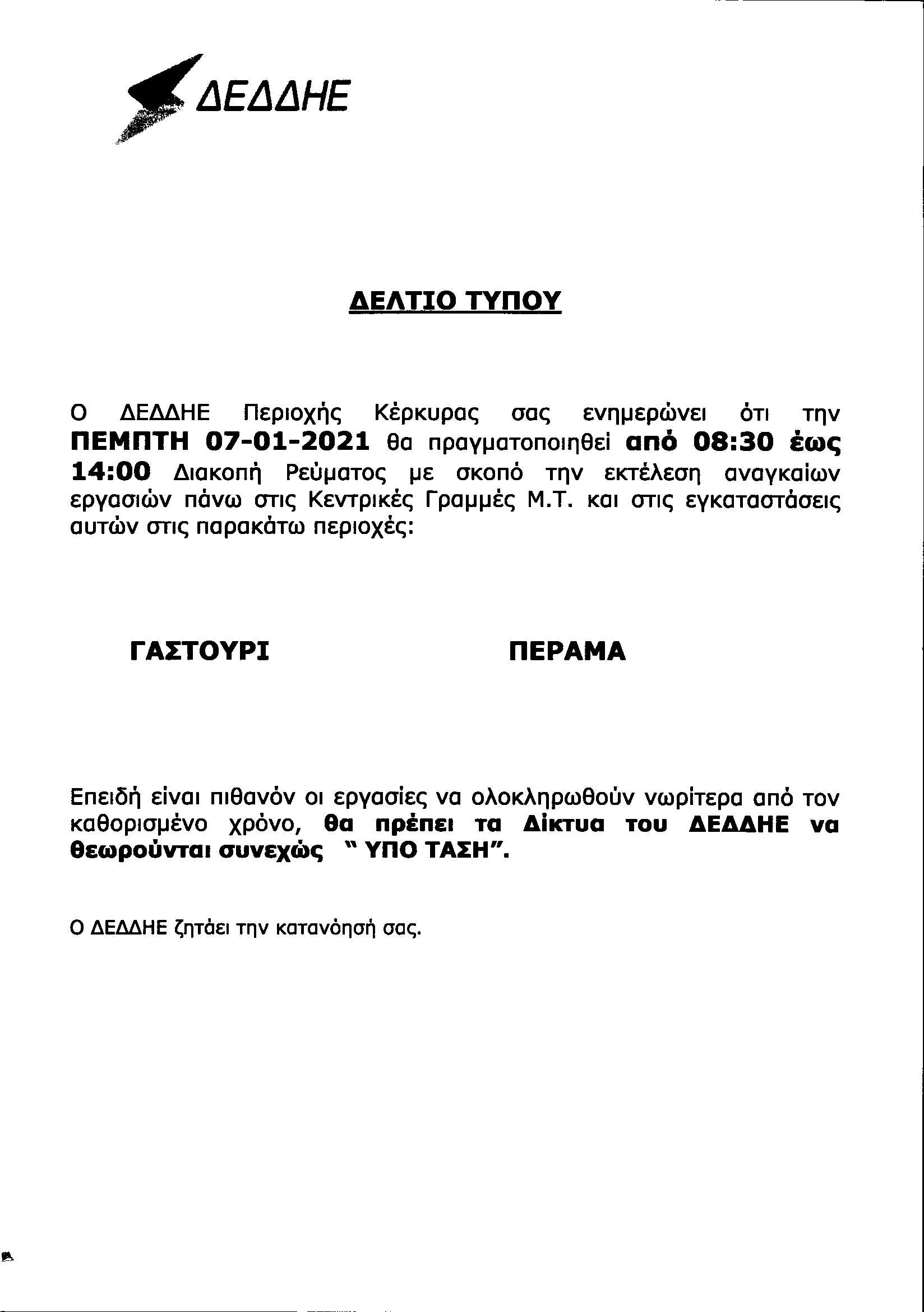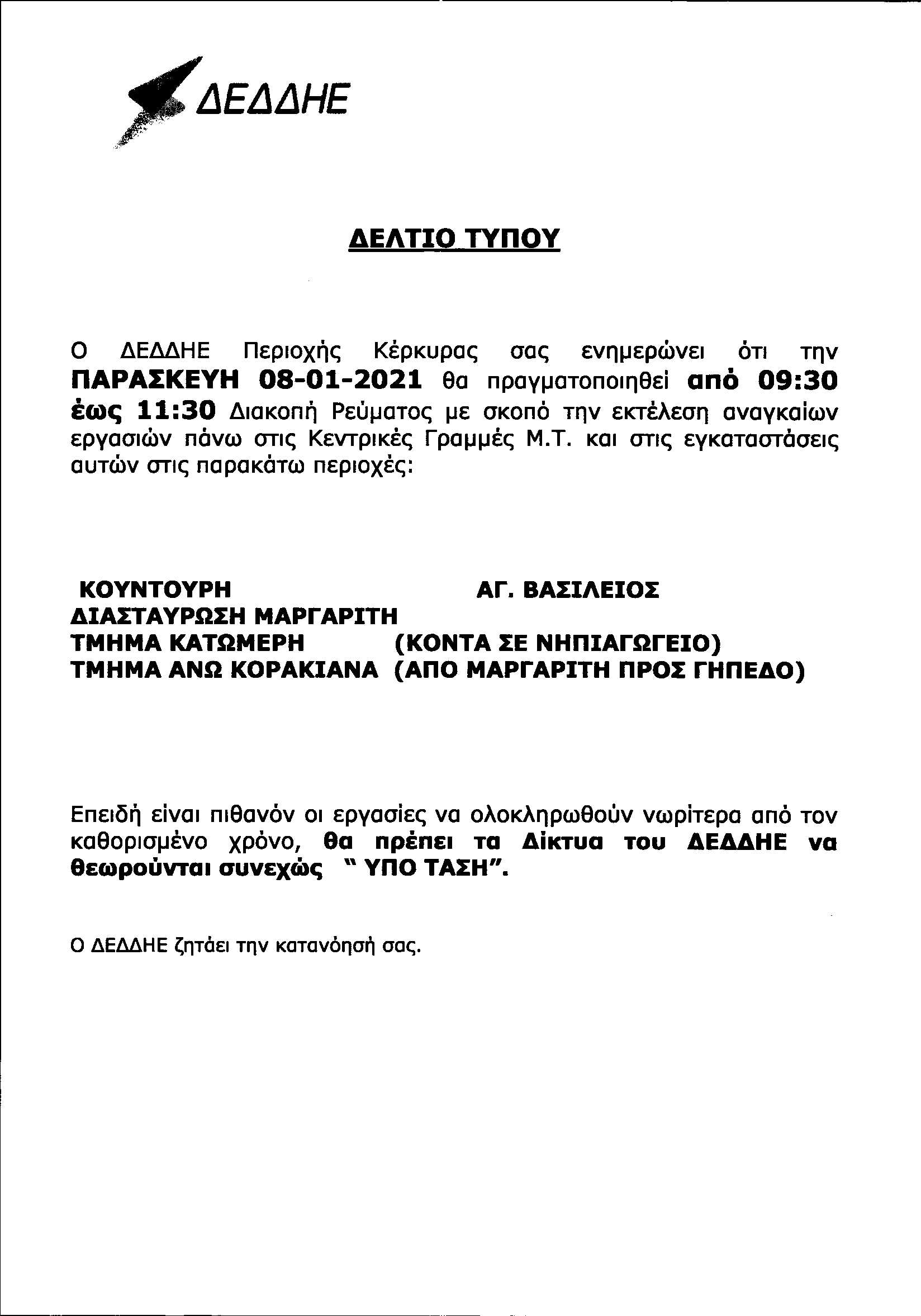 ΚΟΙΝΩΝΙΑΕΛΕΥΘΕΡΟΕΙΔΗΣΕΙΣ Διακοπές ρεύματος την Πέμπτη και την Παρασκευή Αιτία, η εκτέλεση αναγκαίων εργασιών από τον ΔΕΔΔΗΕ. Last updated: 04/01/2021 13:59 CorfuPress.com Published: 04/01/2021 Share SHARE Αιτία, η εκτέλεση αναγκαίων εργασιών από τον ΔΕΔΔΗΕ. Διακοπή ρεύματος τη Δευτέρα-Δείτε που Που θα γίνει διακοπή ρεύματος την Τετάρτη Που θα γίνει διακοπή ρεύματος την Τετάρτη Που θα γίνουν προγραμματισμένες διακοπές ρεύματος το διάστημα 23-25 Αυγούστου Έρχεται διακοπή ρεύματος στη Βόρεια Κέρκυρα Share This Article Facebook Whatsapp Whatsapp Email Copy Link Print Previous Article Αυτό είναι το νέο υπουργικό συμβούλιο Next Article Xριστουγεννιάτικα δώρα αγάπης από το Ροταριανό Όμιλο “Κέρκυρα-Καποδίστριας” στο ΧτΠ Δεν υπάρχουν Σχόλια Δεν υπάρχουν Σχόλια Αφήστε μια απάντηση Ακύρωση απάντησηςΗ ηλ. διεύθυνση σας δεν δημοσιεύεται. Τα υποχρεωτικά πεδία σημειώνονται με *Σχόλιο * Όνομα * Email * Ιστότοπος Αποθήκευσε το όνομά μου, email, και τον ιστότοπο μου σε αυτόν τον πλοηγό για την επόμενη φορά που θα σχολιάσω. ΑναζήτησηΑναζήτησηRecent PostsΌλα τα μάτια στον Θοδωρή, τον καπετάνιο μας! Τη Δευτέρα 22 Σεπτεμβρίου γιορτάζει… Σαν Σήμερα 22/9: Τα σημαντικότερα γεγονότα… Η πρόγνωση του καιρού Έφηβοι Ιονίου: Με περίπατο, συνεχίζουν στο Rising Stars! Recent CommentsΧωρίς σχόλια για εμφάνιση.