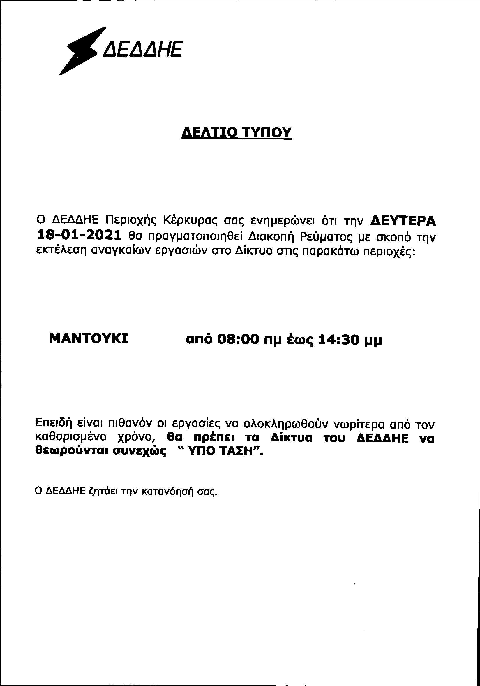 CorfuPress.com > Blog > ΕΙΔΗΣΕΙΣ > ΕΛΕΥΘΕΡΟ > ΚΟΙΝΩΝΙΑ > Έρχεται διακοπή ρεύματος στο Μαντούκι