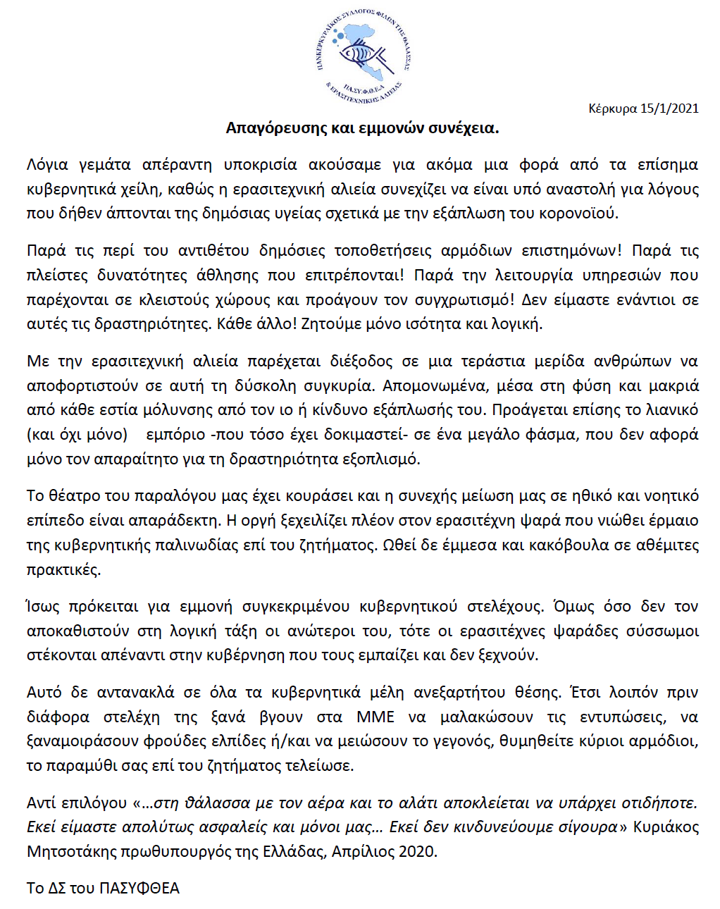 Ανακοίνωση του Πανκερκυραϊκού Συλλογου Φίλων της Θάλασσας και Ερασιτεχνικής Αλιείας με αφορμή το γεγονός ότι ακόμη δεν επιτρέπεται η ερασιτεχνική αλιεία.