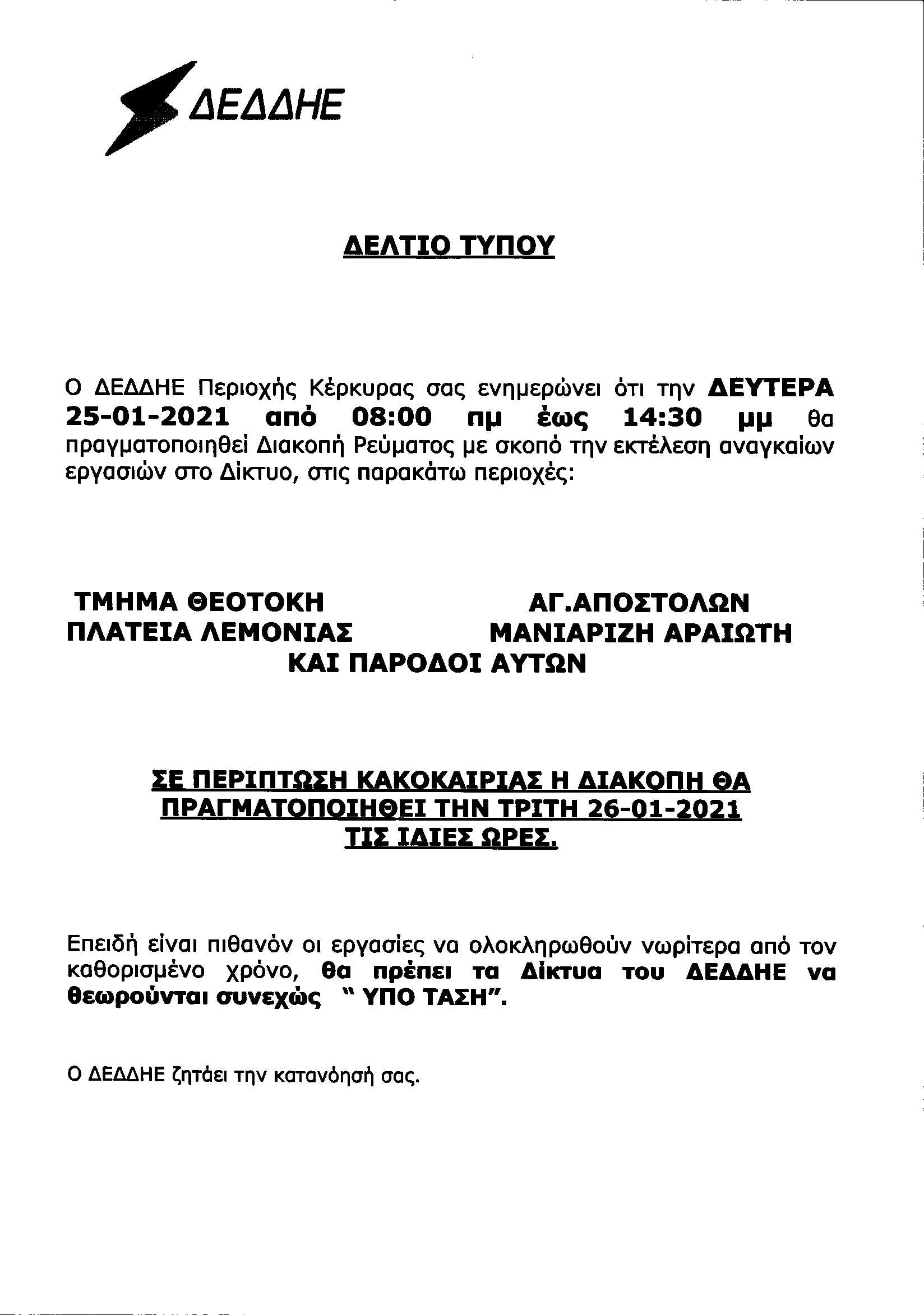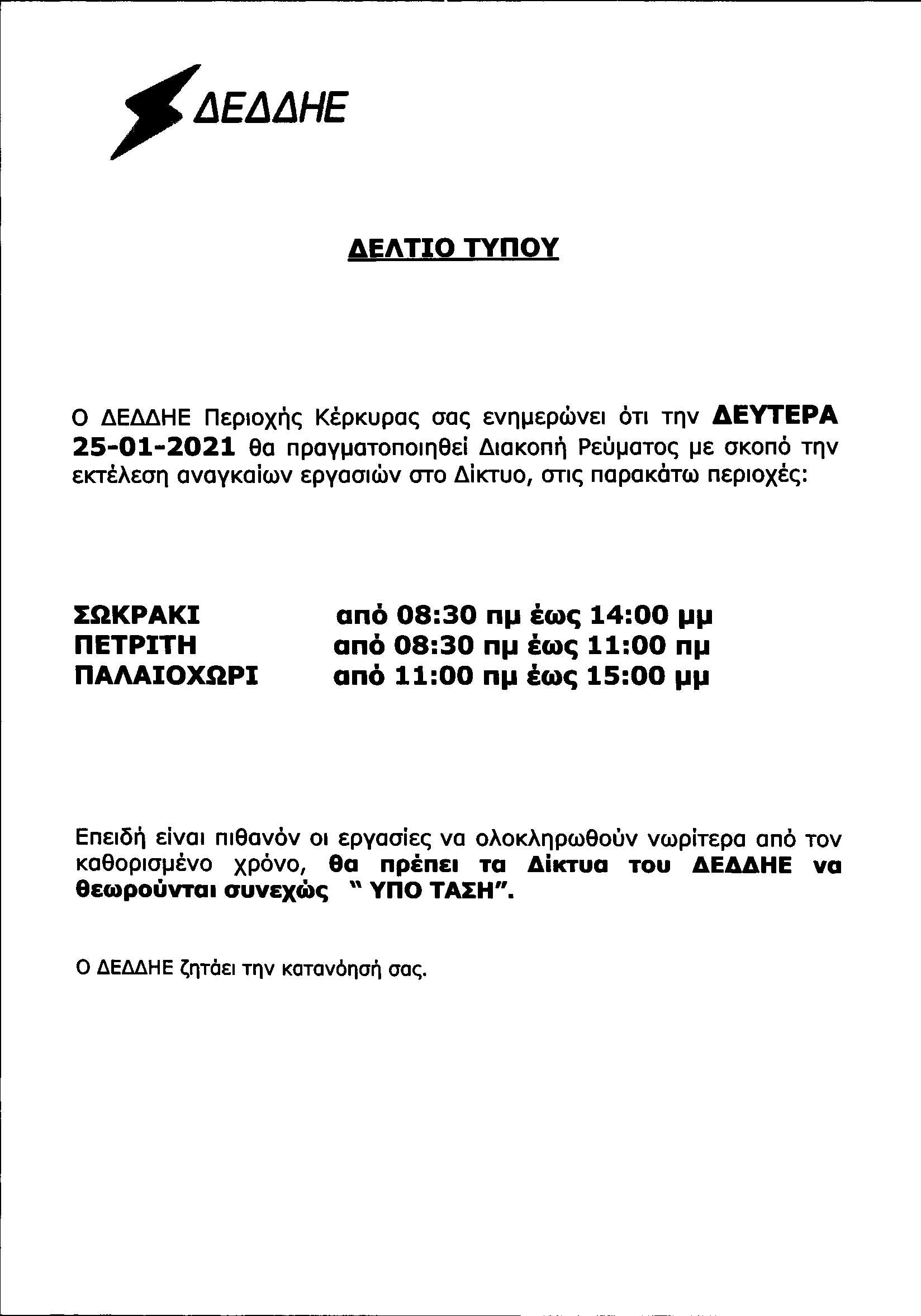 ΚΟΙΝΩΝΙΑΕΛΕΥΘΕΡΟΕΙΔΗΣΕΙΣ Διακοπές ρεύματος σε αρκετές περιοχές την Δευτέρα Νέες διακοπές ρεύματος για την Δευτέρα ανακοίνωσε ο ΔΕΔΔΗΕ σε αρκετές -μάλιστα- περιοχές Last updated: 22/01/2021 16:05 CorfuPress.com Published: 22/01/2021 Share SHARE Νέες διακοπές ρεύματος για την Δευτέρα ανακοίνωσε ο ΔΕΔΔΗΕ σε αρκετές -μάλιστα- περιοχές Δυο αναφορές Αυλωνίτη για τις εκτεταμένες διακοπές ρεύματος στο σύνολο της Κέρκυρας Επιστολή Επιμελητηρίου προς ΔΕΔΔΗΕ για τις πολύωρες διακοπές ρεύματος Έρχεται διακοπή ρεύματος στο Βορρά Έκτακτη διακοπή ρεύματος την Παρασκευή – Δείτε που Διακοπή ρεύματος την Τετάρτη, δείτε που Share This Article Facebook Whatsapp Whatsapp Email Copy Link Print Previous Article Υδραίου: Το Ιόνιο μεγαλώνει… Next Article Αναρτήθηκε ο νέος δασικός χάρτης της Περιφερειακής Ενότητας Κέρκυρας στο Κτηματολόγιο Δεν υπάρχουν Σχόλια Δεν υπάρχουν Σχόλια Αφήστε μια απάντηση Ακύρωση απάντησηςΗ ηλ. διεύθυνση σας δεν δημοσιεύεται. Τα υποχρεωτικά πεδία σημειώνονται με *Σχόλιο * Όνομα * Email * Ιστότοπος Αποθήκευσε το όνομά μου, email, και τον ιστότοπο μου σε αυτόν τον πλοηγό για την επόμενη φορά που θα σχολιάσω. ΑναζήτησηΑναζήτησηRecent PostsΌλα τα μάτια στον Θοδωρή, τον καπετάνιο μας! Τη Δευτέρα 22 Σεπτεμβρίου γιορτάζει… Σαν Σήμερα 22/9: Τα σημαντικότερα γεγονότα… Η πρόγνωση του καιρού Έφηβοι Ιονίου: Με περίπατο, συνεχίζουν στο Rising Stars! Recent CommentsΧωρίς σχόλια για εμφάνιση.