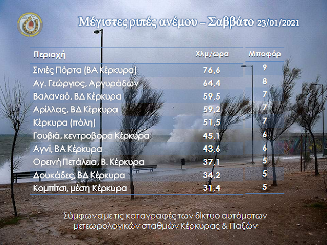 Εντυπωσιακά ισχυροί ήταν οι άνεμοι που στις Σινιές έφτασαν τους πολύ θυελλώδεις στα 9 μποφόρ! Ακόμα και στην πόλη της Κέρκυρας, καταγράφηκαν στιγμές όπου ο αέρας είχε ταχύτητα 7 μποφόρ, ενώ σφοδροί έως θυελλώδεις αναμένεται να είναι κατά περιόδους οι άνεμοι και σήμερα, Κυριακή!