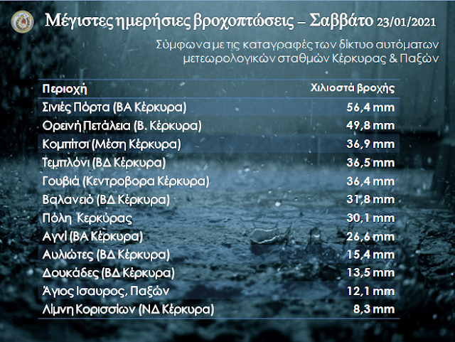 Όπως αναφέρει χαρακτηριστικά στο Facebook ο Νικόλαος Βλάχος, «μέσα σε λίγα λεπτά έριξε καρεκλοπόδαρα και με θυελλώδης άνεμους στην ορεινή Πετάλεια (Βόρεια Κέρκυρα) με υψόμετρο 650 μέτρων ! Με μέγιστη ραγδαιότητα 500,8 mm/hr».