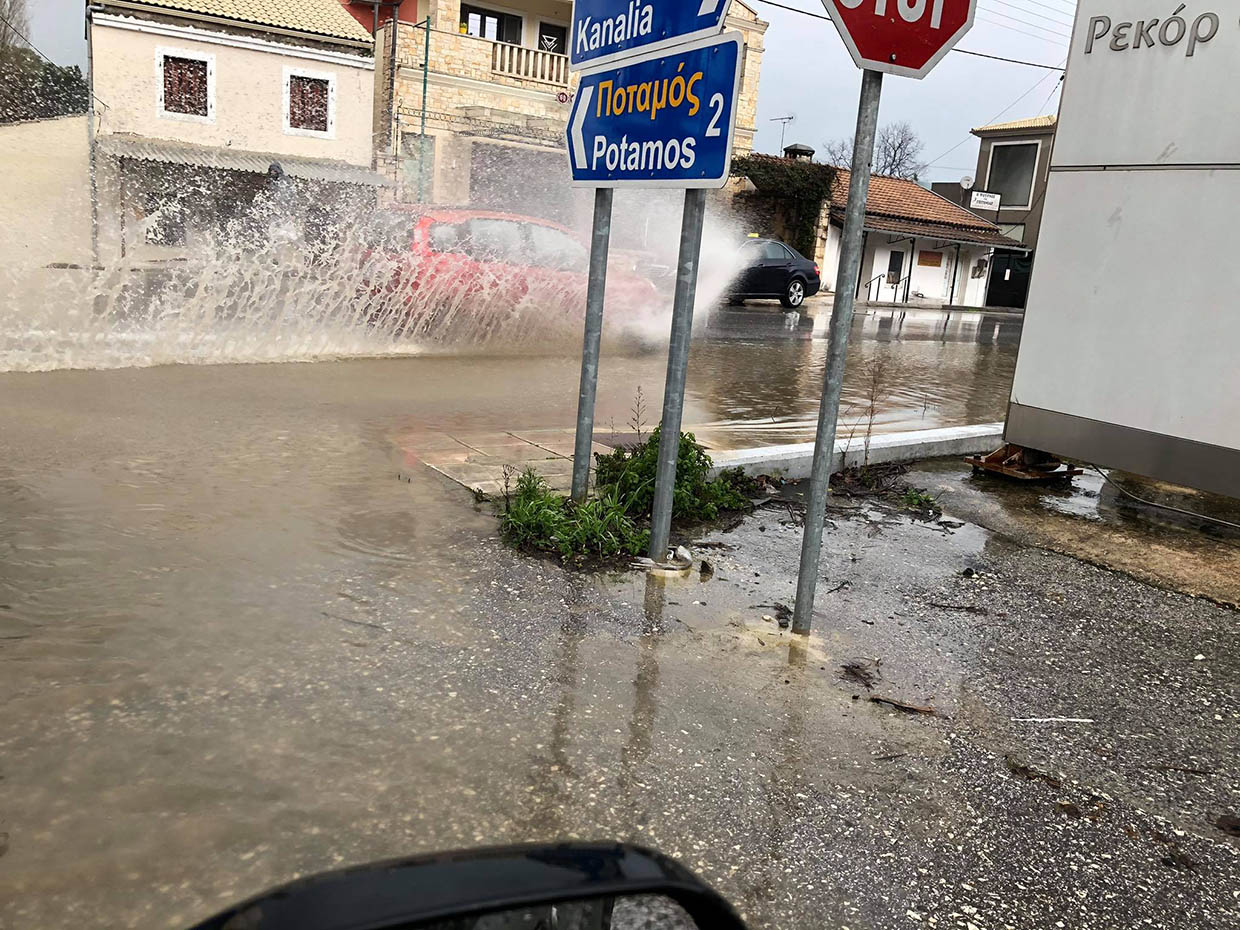 Πλημμυρικά φαινόμενα καταγράφηκαν για αρκετή ώρα νωρίς το απόγευμα στη διασταύρωση της εθνικής οδού Πέλεκα προς τα Κανάλια, αλλά και στον εσωτερικό δρόμο του Ποταμού.