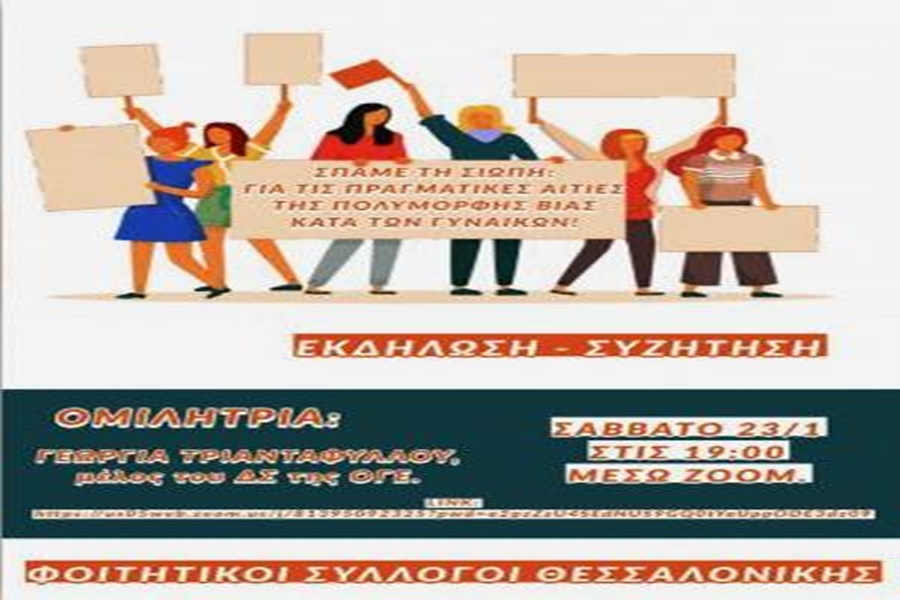 Διαδικτυακή εκδήλωση – συζήτηση με τίτλο «Σπάμε τη σιωπή: Για τις πραγματικές αιτίες της πολύμορφης βίας κατά των γυναικών», διοργανώνουν Φοιτητικοί Σύλλογοι της Θεσσαλονίκης, με αφορμή τα πρόσφατα περιστατικά σεξουαλικής παρενόχλησης στο ΑΠΘ που είδαν το φως της δημοσιότητας.