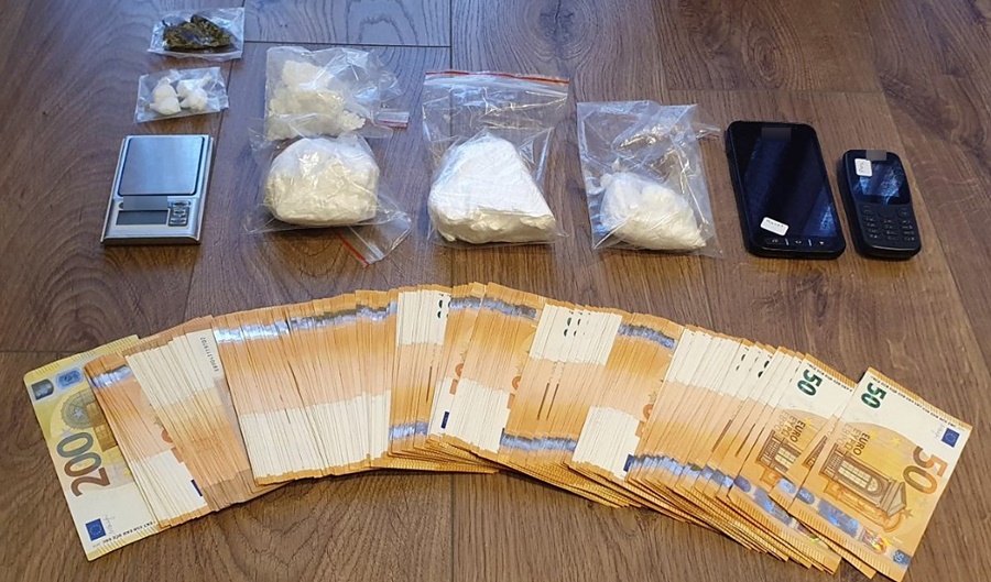 Κατασχέθηκαν μεταξύ άλλων 348 περίπου γραμμάρια κοκαΐνης, μικροποσότητα κάνναβης και το χρηματικό ποσό των 12.200 ευρώ