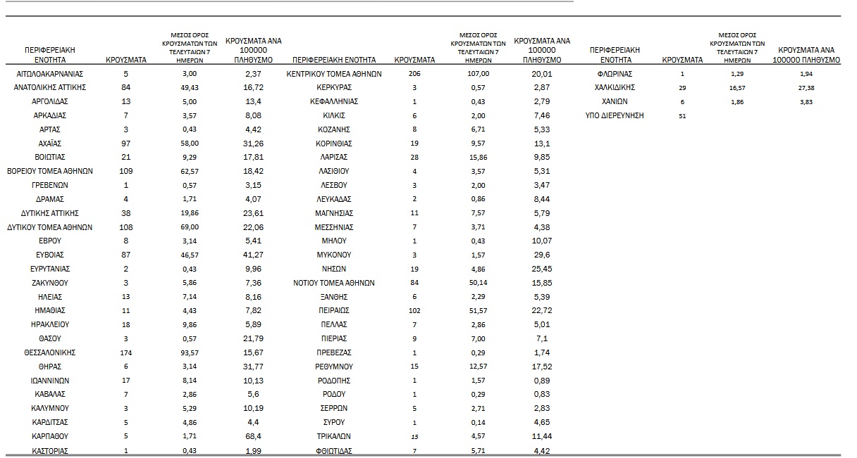 Αναλυτικά, η διασπορά των νέων κρουσμάτων ανά περιφερειακή ενότητα έχει ως εξής: