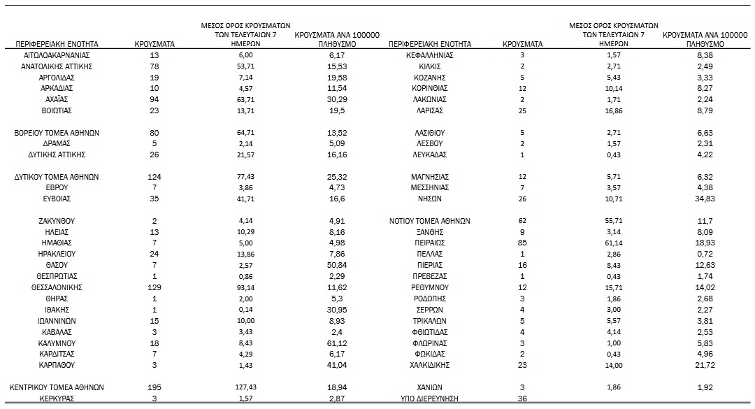 Αναλυτικά, η διασπορά των κρουσμάτων της Πέμπτης ανά περιφερειακή ενότητα: