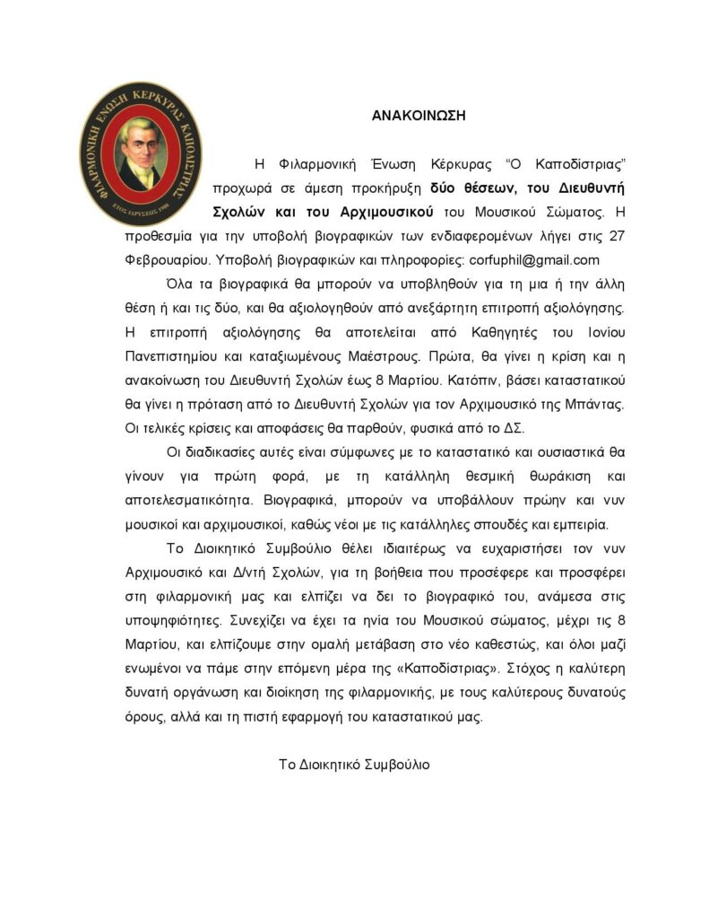 Το ΔΣ της Φιλαρμονικής αναφέρει πως ελπίζει να δει μεταξύ των βιογραφικών που θα σταλούν κι εκείνο του νυν δ/ντη και αρχιμουσικού.