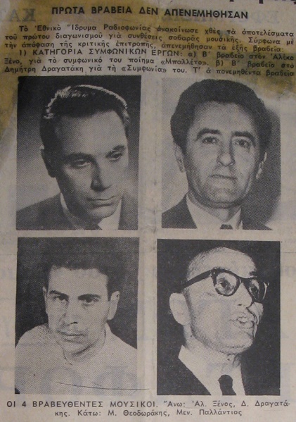 Δύο χρόνια αργότερα, τα τέλη του 1962, στον πρώτο διαγωνισμό του Εθνικού Ιδρύματος Ραδιοφωνίας για «συνθέσεις σοβαράς μουσικής» απονεμήθηκαν ισότιμα βραβεία στον Αλέκο Ξένο, τον Μίκη Θεοδωράκη, τον Γιαννιώτη Δημήτρη Δραγατάκη και τον Πειραιώτη Μενέλαο Παλλάντιο, μετέπειτα ακαδημαϊκό που για το συνθετικό έργο των Επτανήσιων μουσουργών είπε από νωρίς ότι «αποτελεί το γερό θεμέλιο του ελληνικού μουσικού πολιτισμού».