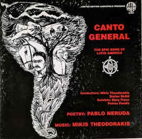 Ήταν το «Canto General» για τη γραμμένη στην ισπανική γλώσσα ομώνυμη μεγαλόπνοη οικουμενική εξεγερτική ποιητική σύνθεση του Νομπελίστα Χιλιανού επαναστάτη ποιητή Πάμπλο Νερούδα, φίλου του Πάμπλο Πικάσο, που είχε ήδη μιλήσει και για τη Δημοκρατία στην Ελλάδα εναντίον της Χούντας με δημόσιες παρεμβάσεις του.