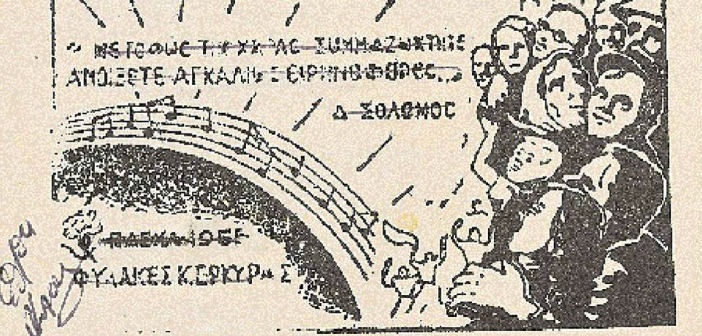 Τότε, στα χρόνια της Αντίστασης, κυνηγημένος, ο Μίκης Θεοδωράκης θα έγραφε την «Πρώτη Συμφωνία» του, προστρέχοντας στο τέλος της στον Σολωμό: «Αύριο θα κόψουμε / κάτι λουλούδια / αύριο θα ψάλουμε / κάτι τραγούδια / εις την πολύανθη / Πρωτομαγιά».