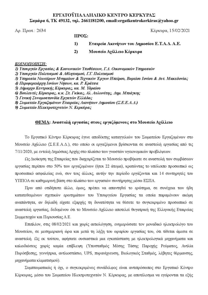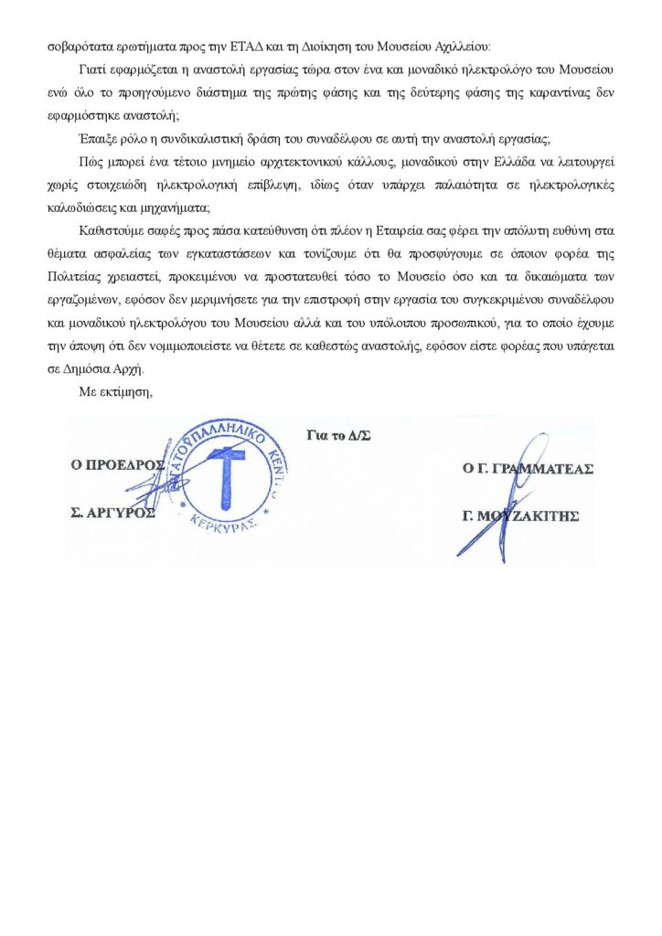 Επιστολή του Εργατικού Κέντρου προς την ΕΤΑΔ και το Μουσείο του Αχιλλείου σχετικά με την απόφαση να τεθεί σε αναστολή ο μοναδικός ηλεκτρολόγος του μουσείου.