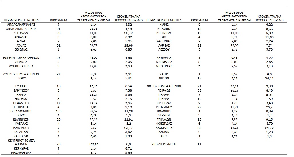Αναλυτικά, η διασπορά των νέων κρουσμάτων ανά περιφερειακή ενότητα έχει ως εξής: