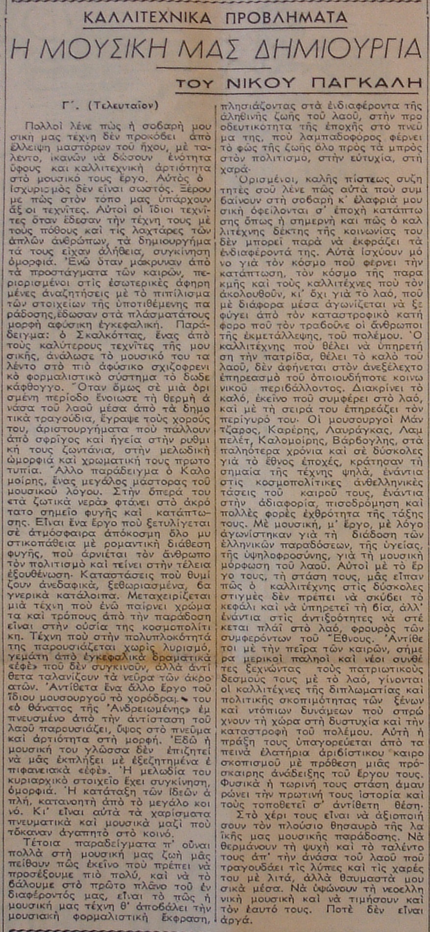 Είτε διανύουμε μια νέα εποχή κατάπτωσης και ισχύουν και σήμερα είτε όχι τα λόγια του Βρετανού θεατρικού συγγραφέα Νόελ Κάουαρντ πως «είναι απίστευτο πόση δύναμη έχει η φτηνή μουσική», τι λέτε, ισχύουν και σήμερα ή όχι τα λόγια που ο Επτανήσιος αν δεν κάνουμε λάθος μουσικοκριτικός Νίκος Πάγκαλης, αδελφός της συζύγου του Νίκου Σκαλκώτα, είχε διατυπώσει σε άρθρο του στην αθηναϊκή εφημερίδα «Αυγή», με τον τίτλο «Η μουσική μας δημιουργία», το 1953;