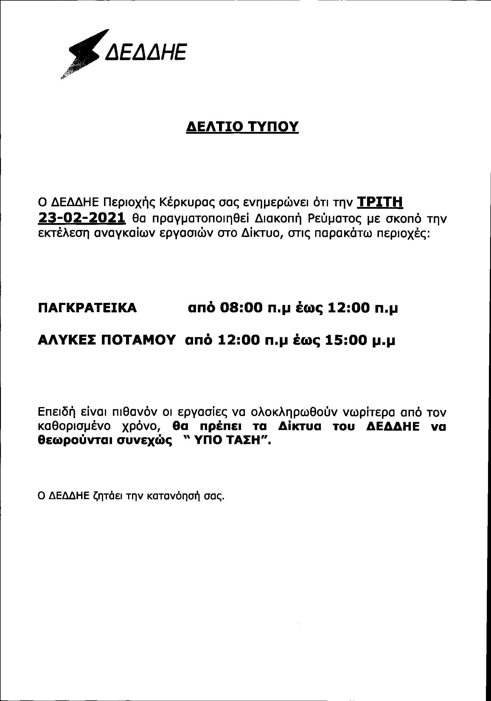 ΚΟΙΝΩΝΙΑΕΛΕΥΘΕΡΟΕΙΔΗΣΕΙΣ Διακοπή ρεύματος σε Παγκρατέικα και Αλυκές Ποταμού Η διακοπή θα πραγματοποιηθεί την Τρίτη, λόγω εργασιών του ΔΕΔΔΗΕ. Last updated: 05/10/2025 05:05 CorfuPress.com Published: 22/02/2021 Share SHARE Η διακοπή θα πραγματοποιηθεί την Τρίτη, λόγω εργασιών του ΔΕΔΔΗΕ. Διακοπή ρεύματος τη Δευτέρα-Δείτε που Που θα γίνει διακοπή ρεύματος την Τετάρτη Που θα γίνει διακοπή ρεύματος την Τετάρτη Που θα γίνουν προγραμματισμένες διακοπές ρεύματος το διάστημα 23-25 Αυγούστου Έρχεται διακοπή ρεύματος στη Βόρεια Κέρκυρα Share This Article Facebook Whatsapp Whatsapp Email Copy Link Print Previous Article Κέντρο Κοινότητας: Εμβολιασμοί των Ρομά για ηλικίες 60-64 και 75+ Next Article ΚΙΝΑΛ Κέρκυρας: Στηρίζει τα αιτήματα των ξεναγών Δεν υπάρχουν Σχόλια Δεν υπάρχουν Σχόλια Αφήστε μια απάντηση Ακύρωση απάντησηςΗ ηλ. διεύθυνση σας δεν δημοσιεύεται. Τα υποχρεωτικά πεδία σημειώνονται με *Σχόλιο * Όνομα * Email * Ιστότοπος Αποθήκευσε το όνομά μου, email, και τον ιστότοπο μου σε αυτόν τον πλοηγό για την επόμενη φορά που θα σχολιάσω. ΑναζήτησηΑναζήτησηRecent PostsΌλα τα μάτια στον Θοδωρή, τον καπετάνιο μας! Τη Δευτέρα 22 Σεπτεμβρίου γιορτάζει… Σαν Σήμερα 22/9: Τα σημαντικότερα γεγονότα… Η πρόγνωση του καιρού Έφηβοι Ιονίου: Με περίπατο, συνεχίζουν στο Rising Stars! Recent CommentsΧωρίς σχόλια για εμφάνιση.