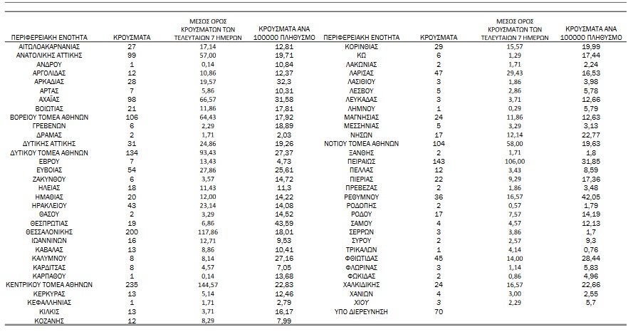 Αναλυτικά, η διασπορά των κρουσμάτων ανά περιφερειακή ενότητα έχει ως εξής: