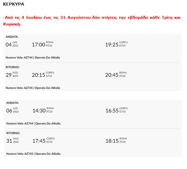 Η αεροπορική εταιρεία Alitalia ανακοίνωσε το φετινό καλοκαιρινό της πρόγραμμα στο οποίο συμπεριλαμβάνονται για μια ακόμα χρονιά πτήσεις προς την Κέρκυρα, αλλά και τη τη Ζάκυνθο και την Κεφαλονιά από το αεροδρόμιο Φιουμιτσίνο της Ρώμης.