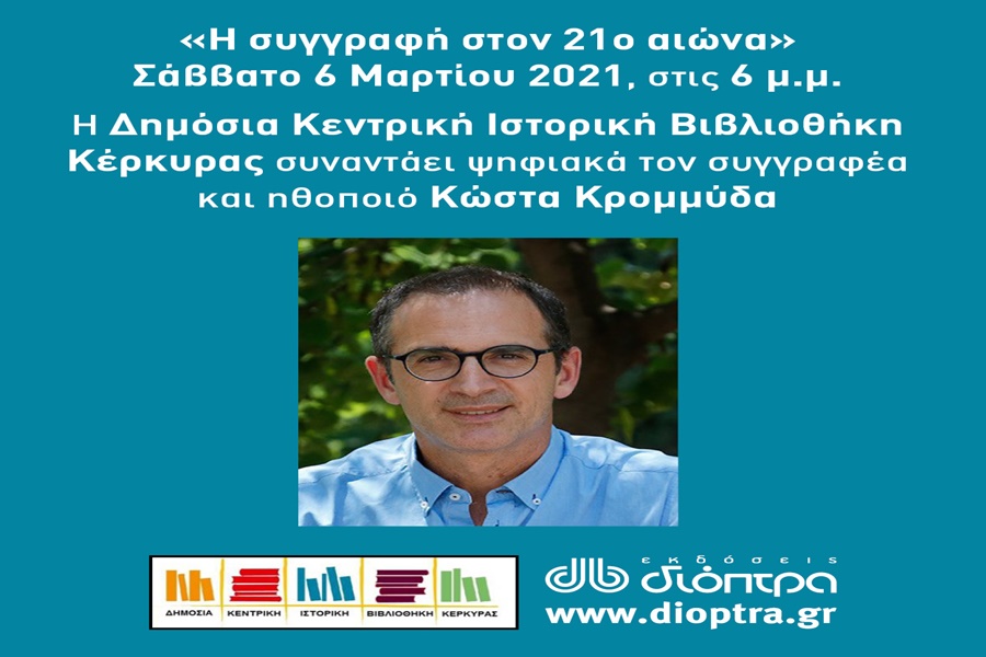 Η Δημόσια Κεντρική Ιστορική Βιβλιοθήκη Κέρκυρας διοργανώνει διαδικτυακή συνάντηση με τίτλο: «Η συγγραφή στον 21ο αιώνα» το Σάββατο 6 Μαρτίου 2021, στις 6 μ.μ. με τον συγγραφέα – ηθοποιό Κώστα Κρομμύδα.