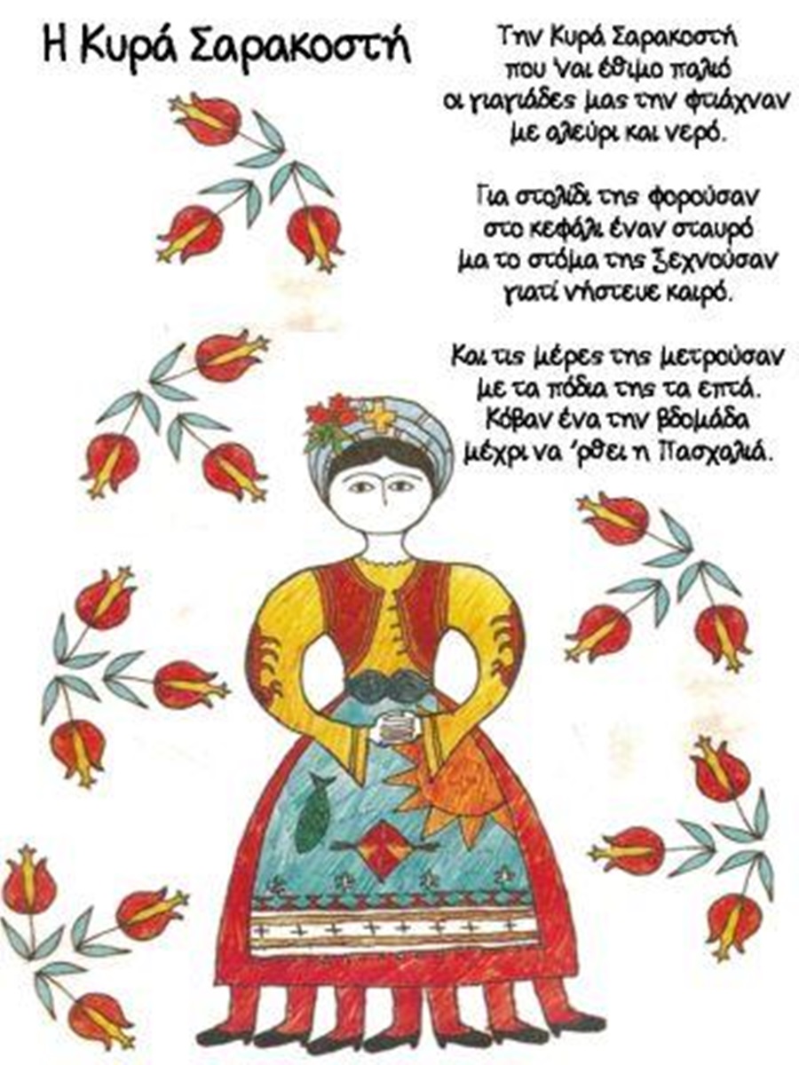 Η κυρά-Σαρακοστή, στις περισσότερες περιοχές, ήταν μια χάρτινη ζωγραφιά, που απεικόνιζε μια γυναίκα, που έμοιαζε με καλόγρια, με 7 πόδια, σταυρωμένα χέρια γιατί προσεύχεται, ένα σταυρό γιατί πήγαινε στην εκκλησία και χωρίς στόμα γιατί νηστεύει. Στο τέλος κάθε εβδομάδας, αρχής γενομένης από το Σάββατο μετά την Καθαρά Δευτέρα, της έκοβαν ένα πόδι. Το τελευταίο το έκοβαν το Μεγάλο Σάββατο. Αυτό το κομμάτι χαρτί το δίπλωναν καλά και το έκρυβαν σε ένα ξερό σύκο ή καρύδι (περιοχή της Χίου), το οποίο τοποθετούσαν μαζί με άλλα. Όποιος το έβρισκε θεωρούνταν τυχερός και γουρλής. Σε κάποιες περιοχές, το έβδομο πόδι το τοποθετούσαν μες στο ψωμί της Ανάστασης και όποιος το έβρισκε του έφερνε γούρι.