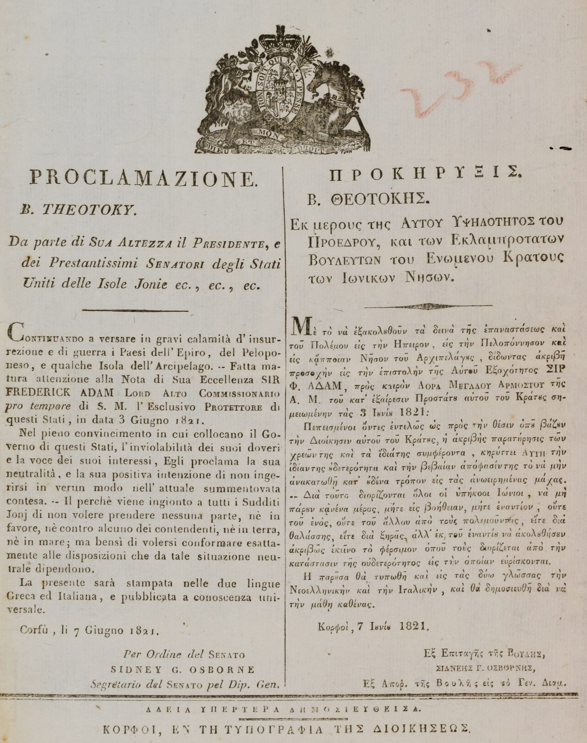 «Επειδή η Διοίκησις του ΚΡΑΤΟΥΣ τούτου επληροφορήθη, ότι μερικά υποκείμενα, υπήκοοι Ιωνικοί ετόλμησαν με ένα Προκήρυγμα τη 1.τη του Ιουνίου 1821 σημειωμένου (το πρωτότυπον του οποίου σώζεται εις χείρας της Διοικήσεως) να κηρυχθώσιν ως αρχηγοί και οδηγοί των Κεφαλληνίτων και Ζακυνθίων, και εν ταυτώ εκπληρωταί των προσταγών ενός ξένου χαρακτηριστικού Υποκειμένου, και ότι οι ειρημένοι με τέτοιον ψειδή και εγκληματικόν φέρσιμον γινόμενοι οδηγοί μερικών καθωπλισμένων ανθρώπων παρομοίως Ιωνικών υπηκόων, απέρασαν εις την Πελοπόννησον να γίνωσιν με το έργον συμμέτοχοι του εκεί πολέμου, πράττοντες ούτως εναντίον του κοινού δικαιώματος των Εθνών, και φανερώς παραβαίνοντες την περί της ουδετερότητος Πράξιν της Διοικήσεως του Κράτους τούτου, η οποία δεν έχει πόλεμον μήτε αυτή, μήτε ο Αύγουστος ΒΑΣΙΛΕΥΣ οπού την προστατεύει, με κανένα από τα δύο μέρη όπου πολεμούν εις την άνωθεν Χερσόνησον, διά τούτο η ΤΕΛΕΣΙΟΥΡΓΟΣ ΕΞΟΥΣΙΑ του Κράτους τούτου κάμνει γνωστόν τοις πάσι διά της παρούσης, ότι εάν οι άνωθεν ονομαζόμενοι αρχηγοί, των οποίων τα ονόματα θα σημειωθώσιν εδώ κάτωθεν, δεν παραιτηθώσιν από την κακήν των ταύτην επιχείρησιν εις το διάστημα δεκαπέντε ημερών από την δημοσίευσιν της παρούσης, και δεν επιστρέψωσιν εις τας Νήσους δια να κριθώσιν, αυτοί θα εννοούνται ως παντοτινά εξόριστοι από τα Ιωνικά χώματα, τα αγαθά των θα γένωσιν Αυθεντικά, και εις κάθε καιρόν οπού πέσωσιν εις χείρας της Διοικήσεως θα τους μεταχειρίζεται, καθώς ο νόμος διορίζει περί των Κεφαλικώς εξορίστων.
