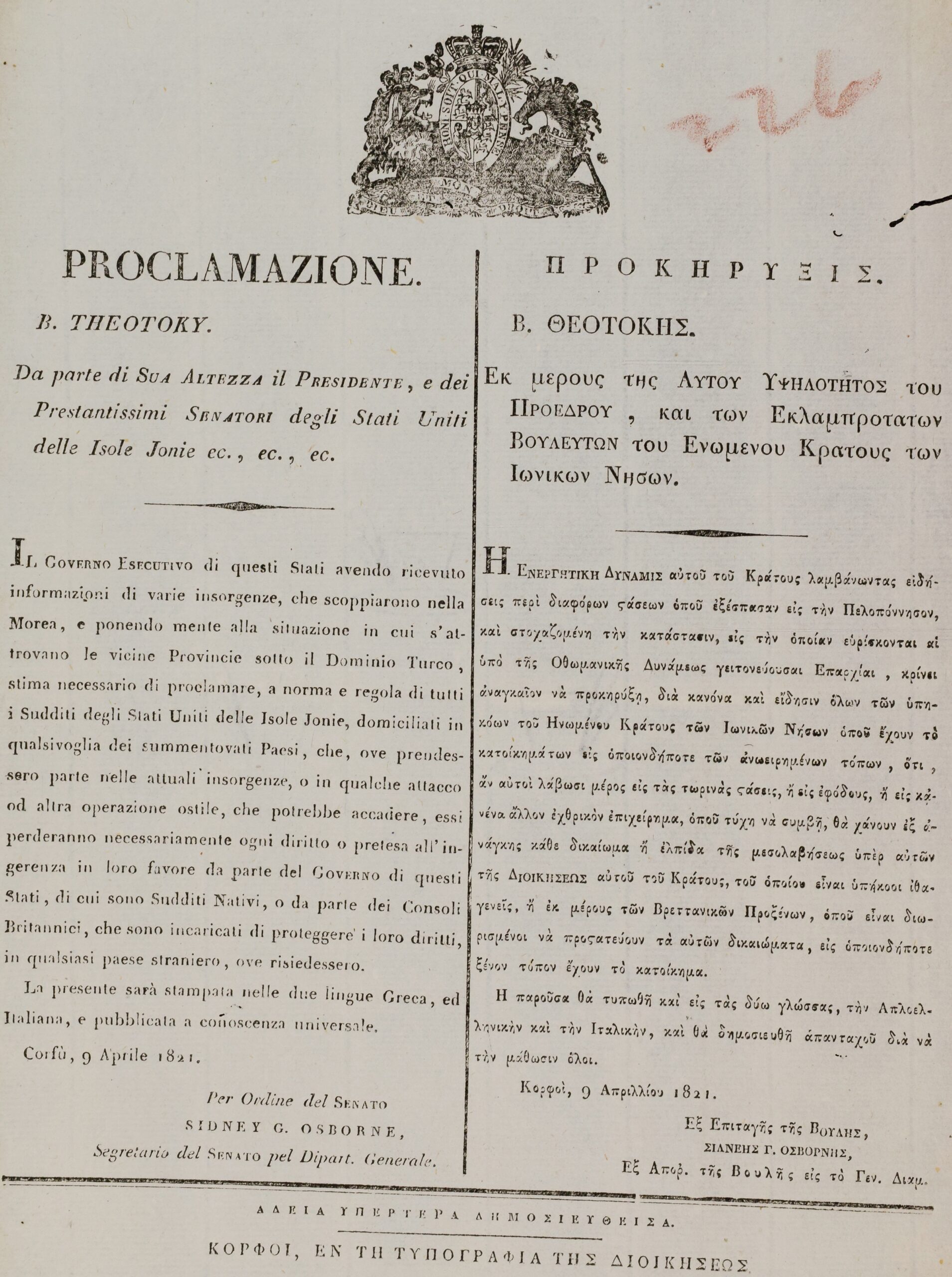 Τις 18 Ιουλίου 1821 η Ιόνιος Γερουσία με την υπογραφή του βαρόνου Θεοτόκη εδημοσίευσε την ακόλουθη αισχρή προκήρυξη:
