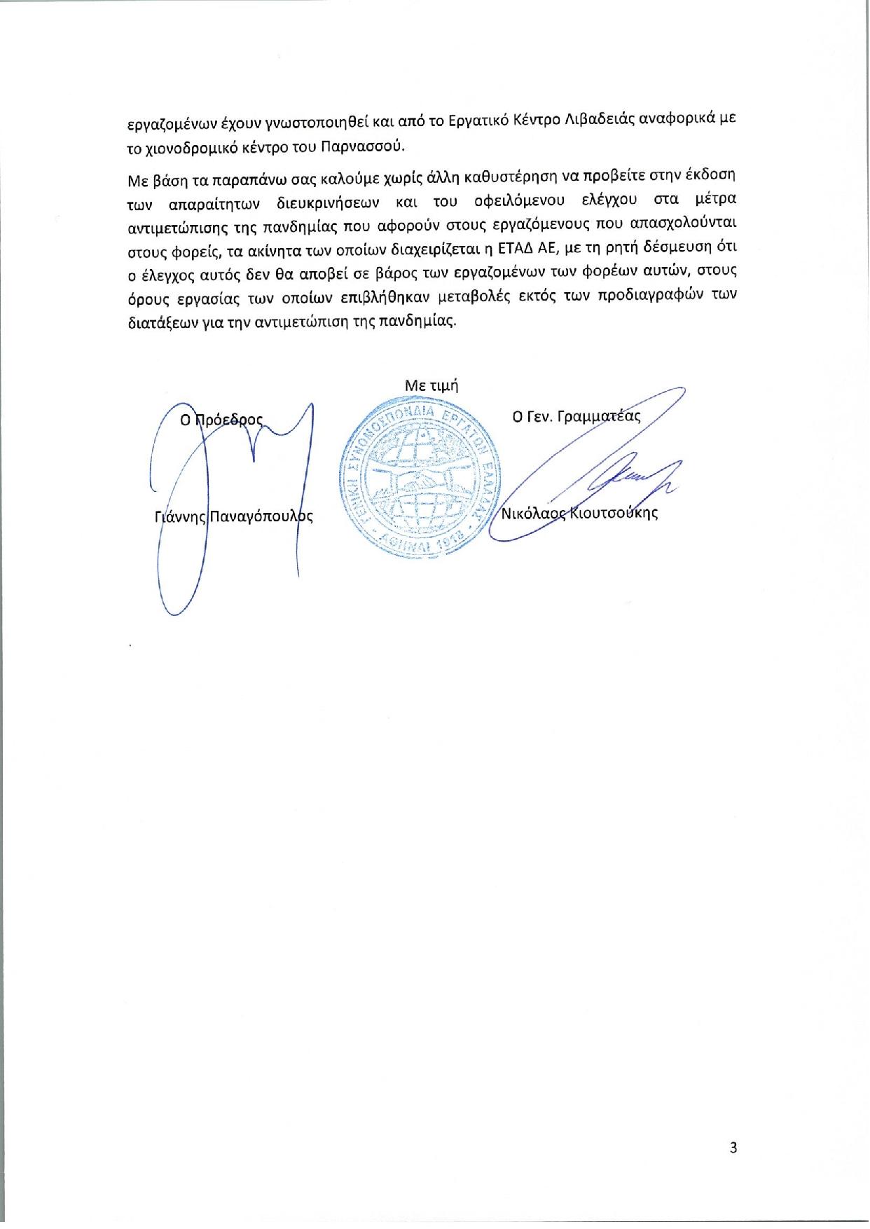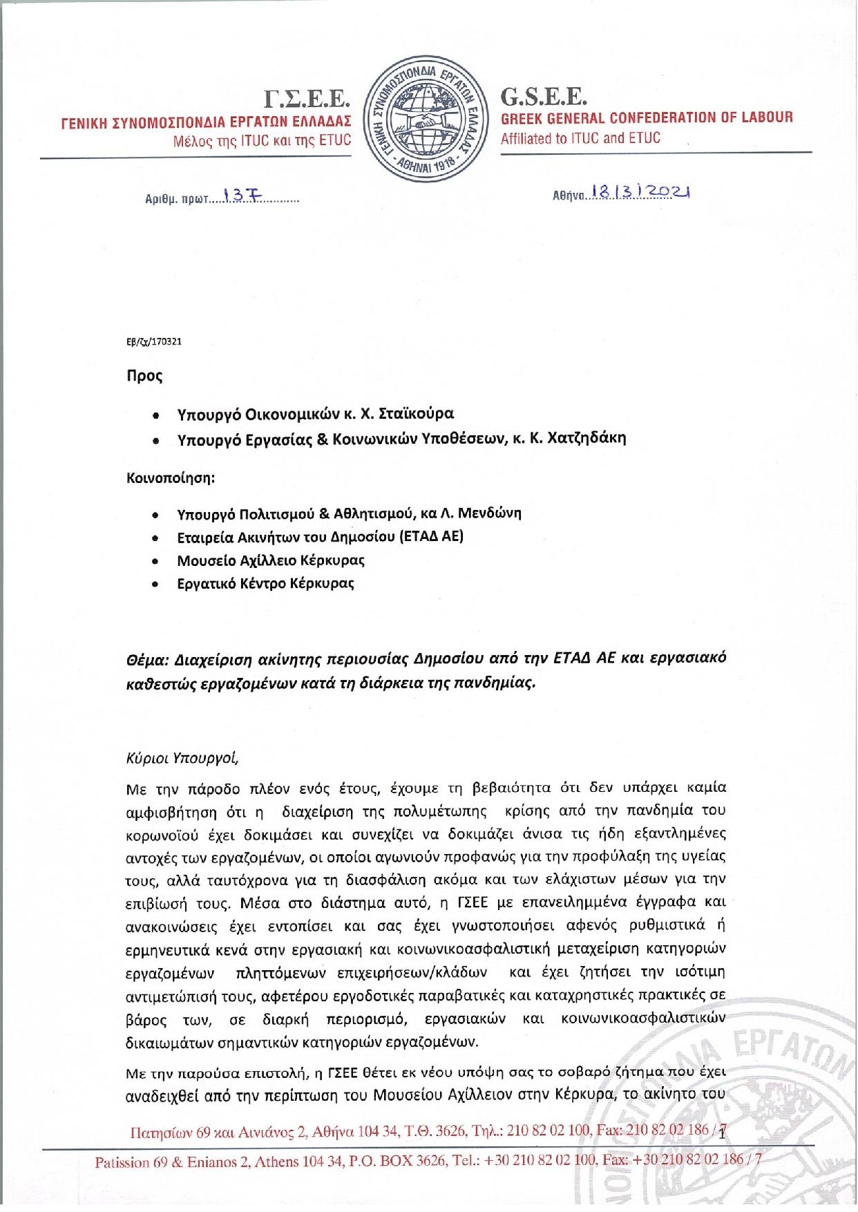 Επιστολή της ΓΣΕΕ με θέμα “διαχείριση της ακίνητης περιουσίας Δημοσίου από την ΕΤΑΔ ΑΕ και εργασιακό καθεστώς εργαζομένων κατά τη διάρκεια της πανδημίας”
