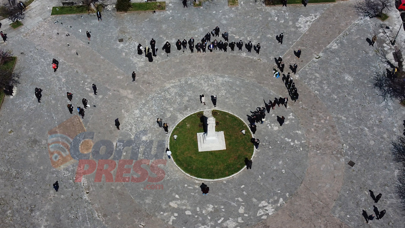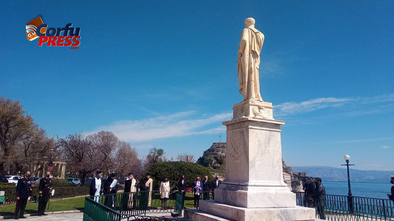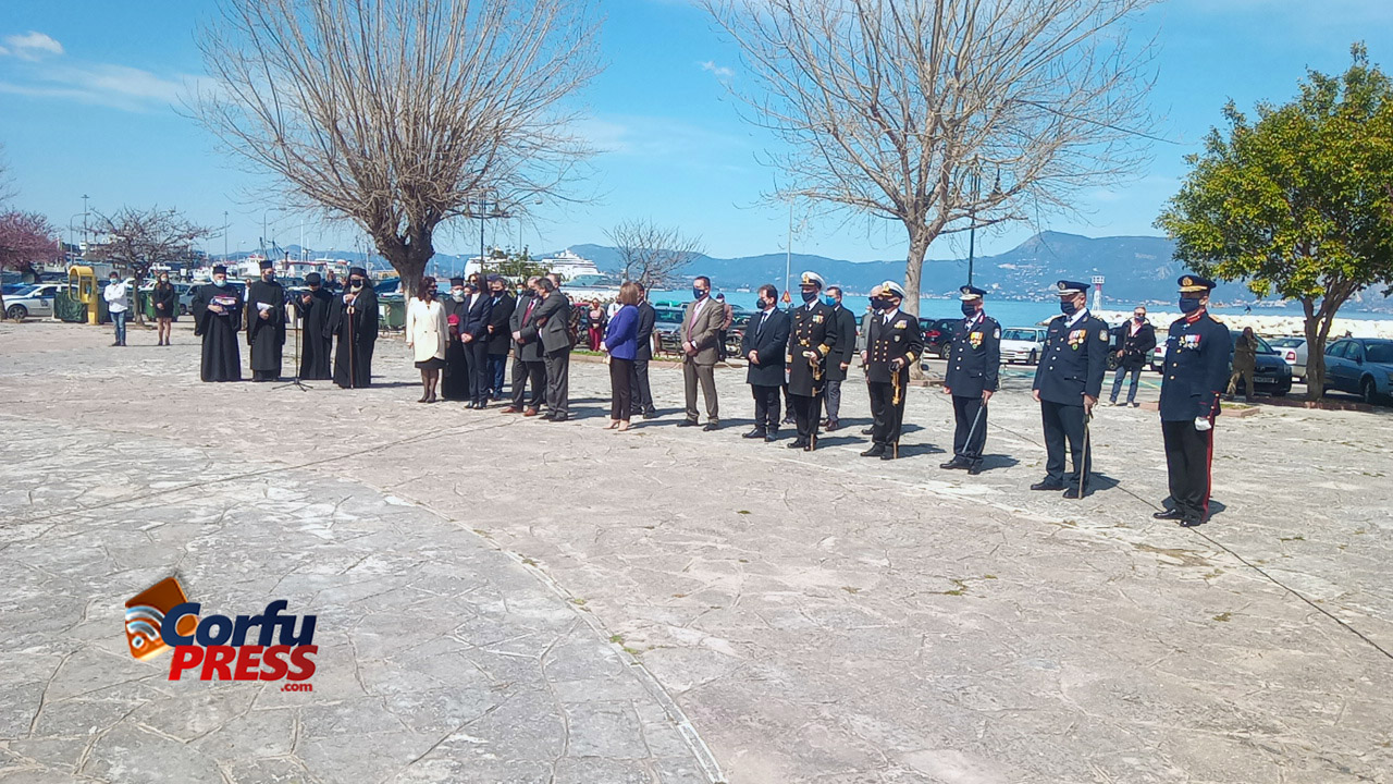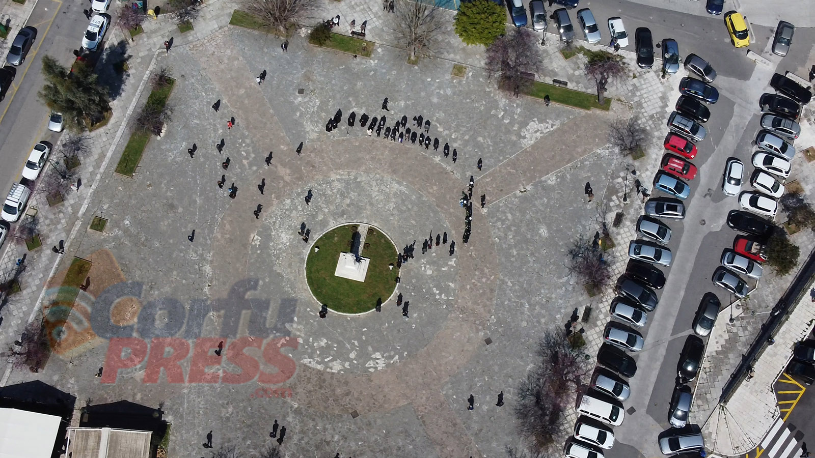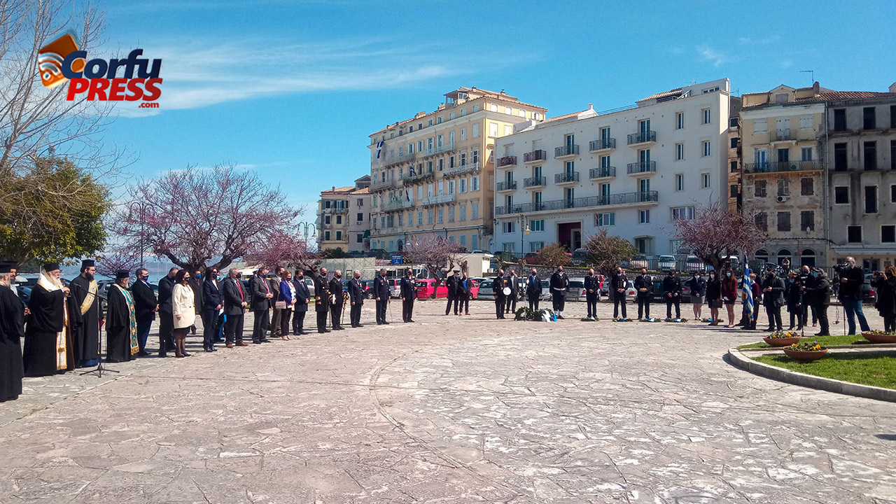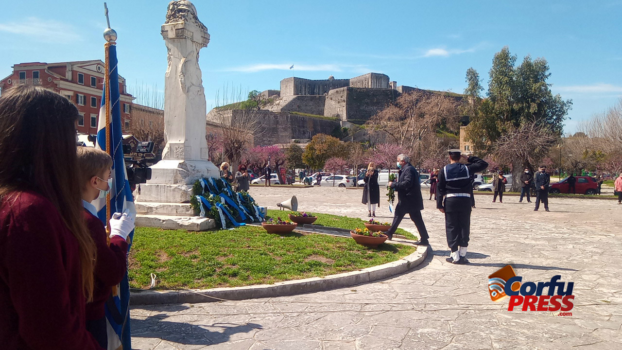 Με ελάχιστο κόσμο που εκείνη την ώρα έκανε περίπατο στην ηλιόλουστη Κέρκυρα, καθώς οι δρόμοι πρόσβασης ήταν αποκλεισμένοι για την αποφυγή συνωστισμού, εκπρόσωποι της πολιτικής, της αυτοδιοικητικής και της πολιτειακής ζωής της Κέρκυρας κατέθεσαν στεφάνια προς τιμήν των ηρώων του ΄21, ενώ λίγο πριν τις 11 τον ουρανό της Κέρκυρας «έσκισαν» τα μαχητικά της Πολεμικής Αεροπορίας που πέταξαν σε όλη τη χώρα για να τιμήσουν τα 200 χρόνια από την Ελληνική Επανάσταση και την Εθνική Παλιγγενεσία.