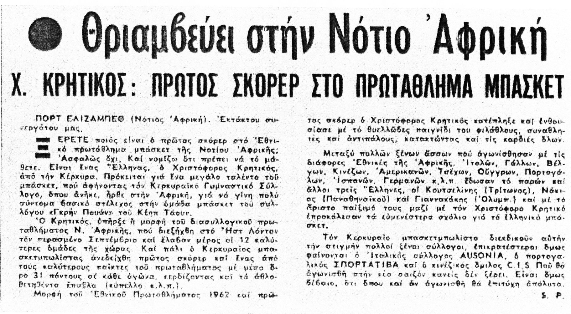 Ο Χριστόφορος Κρητικός είναι ο πρώτος Κερκυραίος καλαθοσφαιριστής που αγωνίστηκε στο εξωτερικό, και συγκεκριμένα στο επαγγελματικό πρωτάθλημα της Νοτίου Αφρικής. Ένα από τα καλύτερα πρωταθλήματα εκείνη την εποχή καθώς αποτελούσε πόλο έλξης για επαγγελματίες παίκτες απ όλο τον κόσμο λόγο της οικονομικής του ευμάρειας! Τα απίστευτα επιτεύγματα του συνοπτικά.