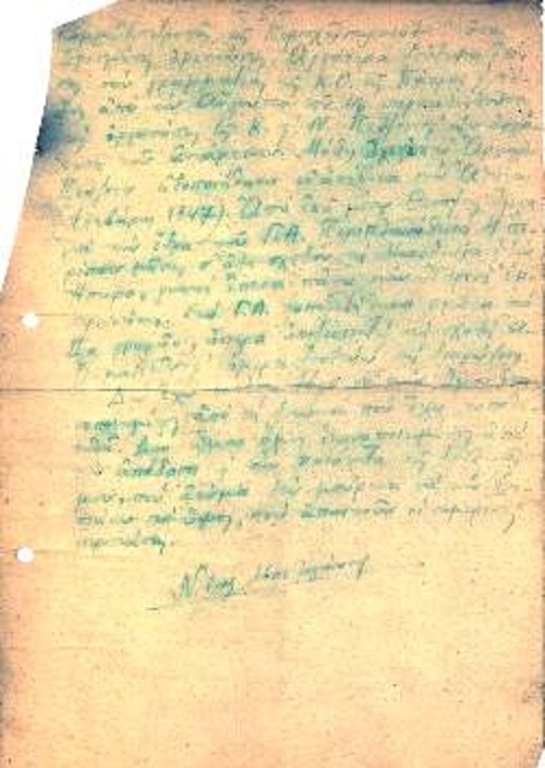 «Με πήγαν στην Αίγινα όπου έμεινα μέχρι την άνοιξη του 1942 και από κει μεταφέρθηκα στην Ακροναυπλία. Το Δεκέμβρη του ’42 οι Ιταλοί μάς πήγανε στα στρατόπεδα Κατούνας, Βόνιτσας, Κέρκυρας. Εκεί με ενέργειες της ομάδας, οι Ιταλοί ξεχώρισαν οχτώ άρρωστους συντρόφους (το Ζαχαράτο, εμένα και 6 άλλους) και μας έστειλαν για τη φυλακή της Σωτηρίας, τέλη Αυγούστου 1943. Με τη συνθηκολόγηση των Ιταλών Σ/βρης 1943 καταφέραμε να απελευθερωθούμε. Στάλθηκα στην Πελ/σο όπου δούλευα σαν β’ στην αρχή και ύστερα σαν α’ Γραμματέας στην ΚΟ της Πάτρας».