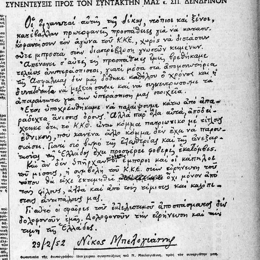 Άνοιξαν την πόρτα και μου λέει ο αρχιφύλακας: “Έλα έξω που σε θέλει ο διευθυντής”. Με πήγαν στο αρχιφυλακείο, όπου βρίσκονταν ο διοικητής και ο υποδιοικητής της φρουράς χωροφυλακής του “καταστήματος”. Πριν μ’ ανοίξουν κουβέντα, ζήτησα να δω τον Μπελογιάννη. Με πήγαν εκεί και ρώτησα το Νίκο τι γίνεται. Στο κελί αυτό ήταν μαζί με τους άλλους δύο μεταγόμενους. Μου είπε πως απλώς τον έβαλαν εκεί, δεν είδε κανέναν αρμόδιο και δεν ξέρει τι γίνεται. Ο διευθυντής, ένας άβουλος γέρος, δεν τόλμησε να παρουσιαστεί. Η διαπραγμάτευση άρχισε με τους αξιωματικούς της χωροφυλακής. Με διαβεβαίωσαν με το λόγο της στρατιωτικής τους τιμής ότι πρόκειται για κανονική μεταγωγή προς Αθήνα. Τίποτα άλλο δεν ήξεραν! Επέμεινα, έπειτα από πολλή συζήτηση, να δω τα αντίστοιχα χαρτιά. Οι “φίλοι” μας αποτραβήχτηκαν για να το συζητήσουν μεταξύ τους.