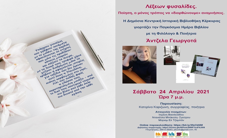 Η Δημόσια Κεντρική Ιστορική Βιβλιοθήκη Κέρκυρας γιορτάζει την Παγκόσμια Ημέρα Βιβλίου με τη Φιλόλογο & Ποιήτρια Άντζελα Γεωργοτά.
