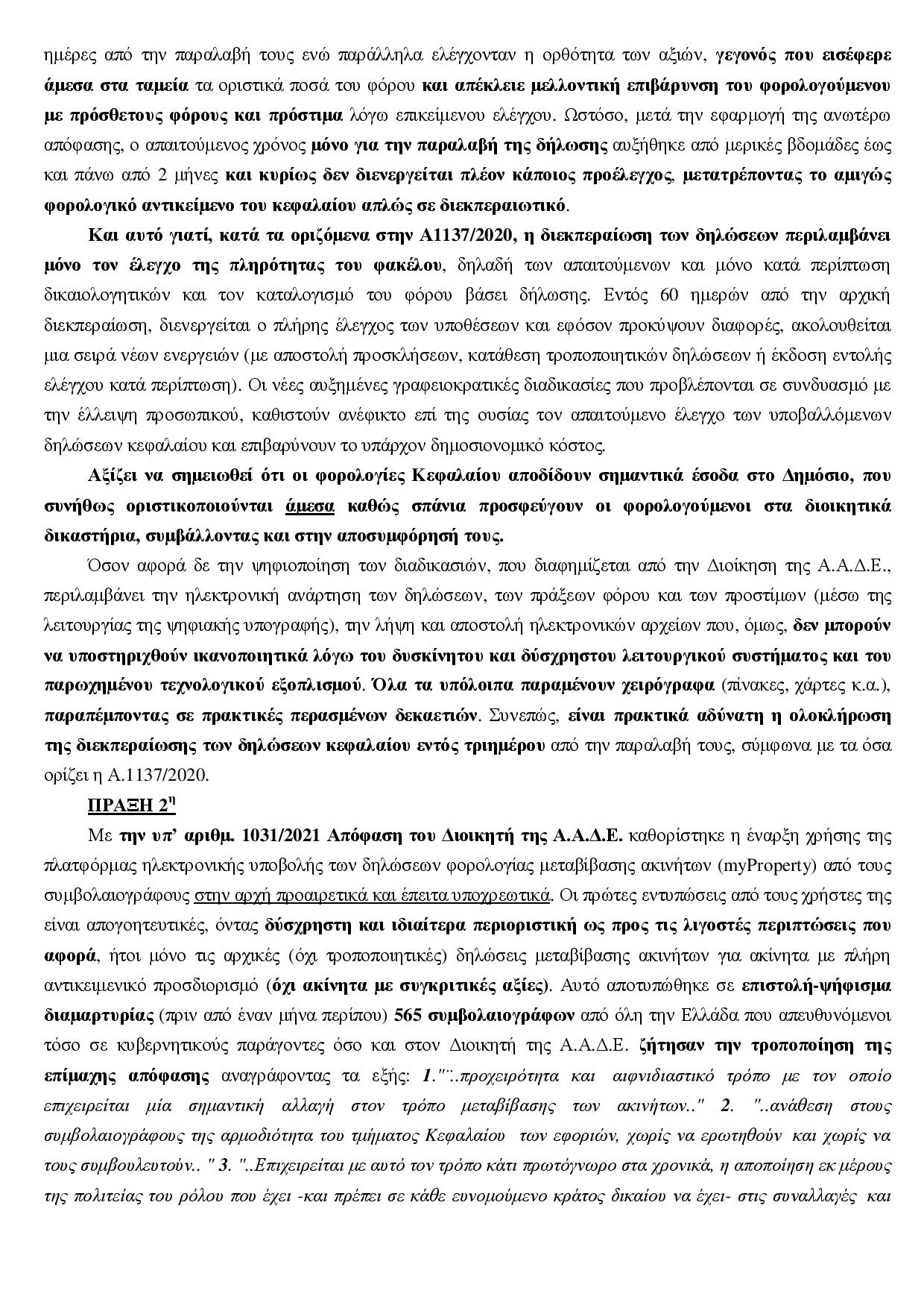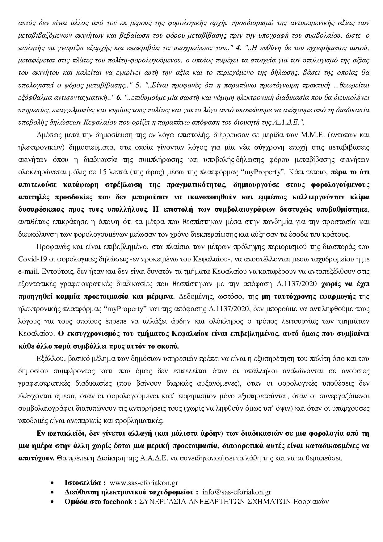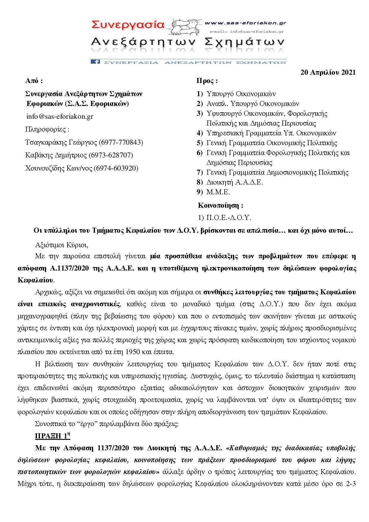 Επιστολή της Συνεργασίας Ανεξάρτητων Σχημάτων Εφοριακών σχετικά με τα προβλήματα που έχουν δημιουργηθεί μετά την απόφαση Α.1137/2020 της Α.Α.Δ.Ε. στα τμήματα Κεφαλαίου των Δ.Ο.Υ..