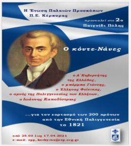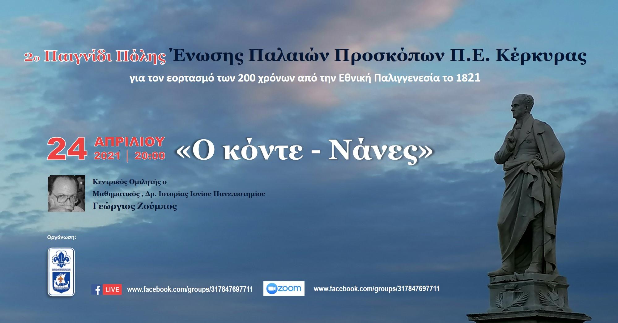 Η Ένωση Παλαιών Προσκόπων της Περιφερειακής Εφορείας Προσκόπων Κέρκυρας ως μια μικρή συμβολή στον εορτασμό των 200 χρόνων από την Εθνική Παλιγγενεσία το 1821, οργάνωσε το 2ο Παιγνίδι Πόλης με θέμα «Ο Κόντε Νάνες» και με σκοπό να τιμήσει την μνήμη και την προσφορά του πρώτου Κυβερνήτη της Ελλάδας Ιωάννη Καποδίστρια, του κόντε Νάνε των Κερκυραίων.