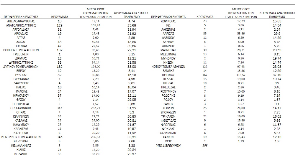 Αναλυτικά, η διασπορά των νέων κρουσμάτων ανά περιφερειακή ενότητα: