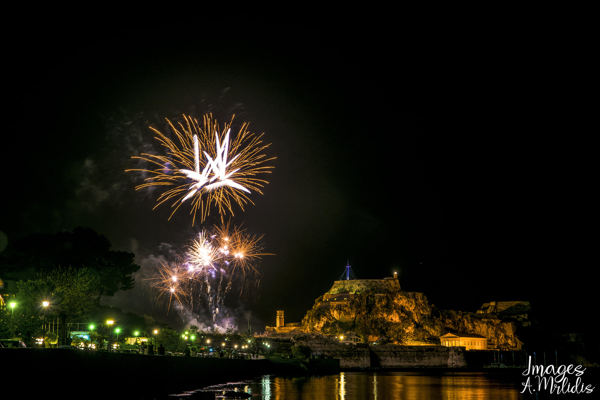 Μια πανδαισία πυροτεχνημάτων γέμισε τον κερκυραϊκό ουρανό ακριβώς στις 12 τα μεσάνυχτα (ώρα, που υπό άλλες συνθήκες θα ακούγοταν το “Χριστός Ανέστη”).