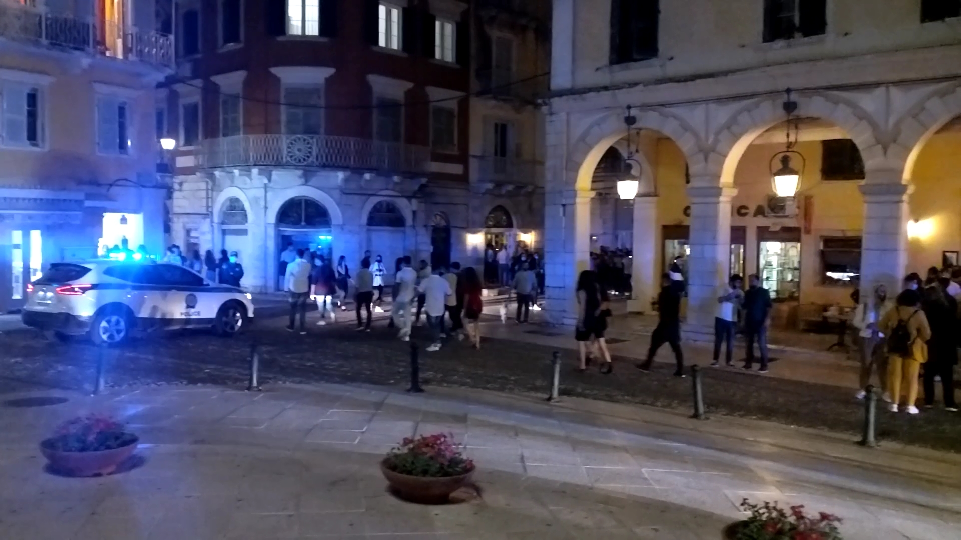Ώρα 10 το βράδυ. Η Αστυνομία επιχειρεί να απομακρύνει εκατοντάδες Κερκυραίους, κυρίως νέους, από το Πεντοφάναρο, το Λιστόν, την Καποδιστρίου με τα μαγαζιά να παραμένουν ανοικτά για παράδοση… στο χέρι!