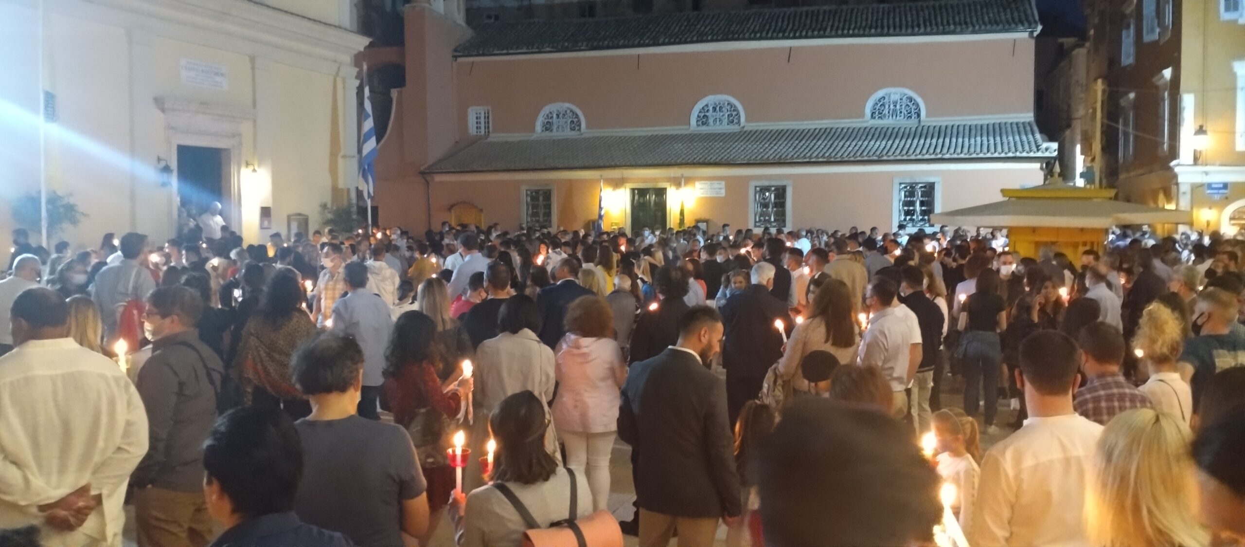 Μεγάλος συνωστισμός υπάρχει αυτή την ώρα σε κεντρικά σημεία της πόλης της Κέρκυρας (Πλατεία, Πλακάδα τ’ Αγιού, Πλατύ Καντούνι) με αφορμή την τελετή της Αναστάσεως.
