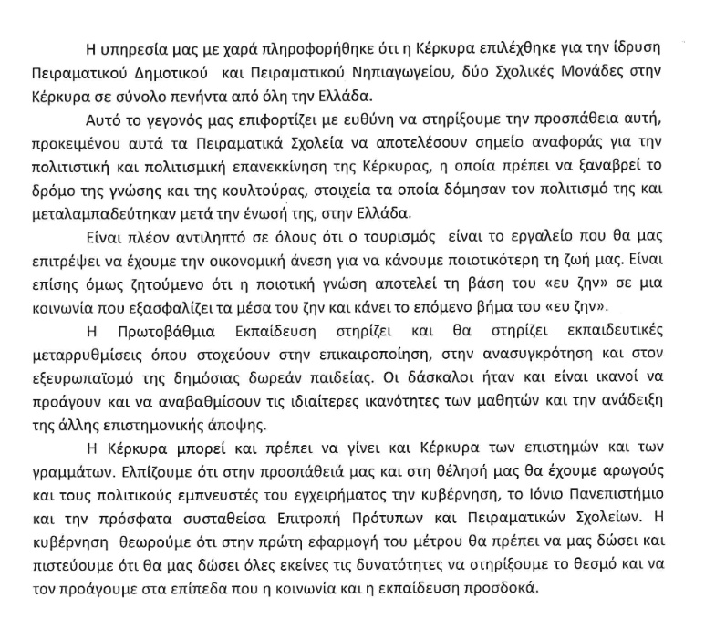 Η Κέρκυρα επιλέχθηκε για την ίδρυση πειραματικού δημοτικού και πειραματικού νηπιαγωγείου.