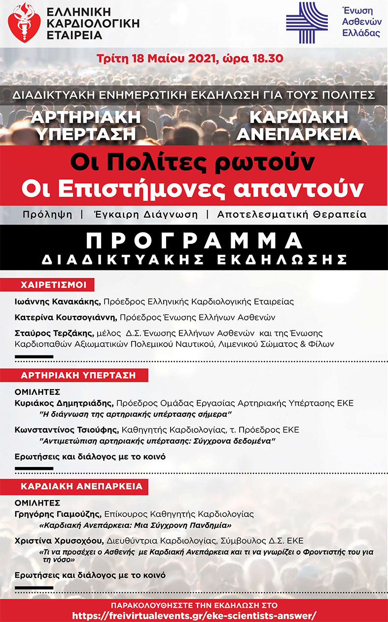 Στα πλαίσια των δράσεων της Υπηρεσία μας για τη προστασία και τη προαγωγή της υγείας των πολιτών, σας ενημερώνουμε για την δυνατότητα συμμετοχής σας στη δωρεάν διαδικτυακή ενημερωτική εκδήλωση για τους πολίτες, που διοργανώνει η Ελληνική Καρδιολογική Εταιρεία σε συνεργασία με την Ένωση Ασθενών Ελλάδας, με θέμα την Υπέρταση και την Καρδιακή Ανεπάρκεια.